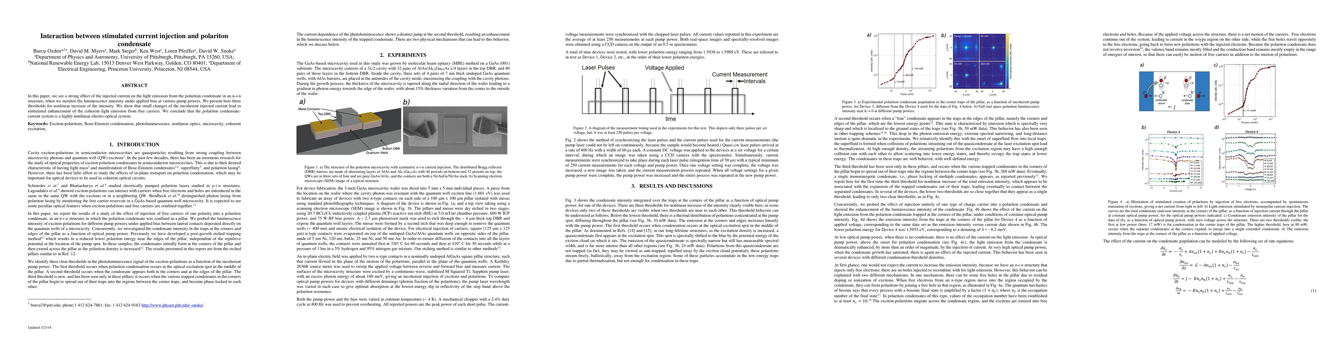 This paper investigates the interaction between stimulated current injection and a polariton condensate, revealing significant effects on light emission in an n-i-n structure. It identifies three thresholds for nonlinear intensity increase and demonstrates that small changes in injected current enhance coherent light emission, indicating a highly nonlinear electro-optical system.