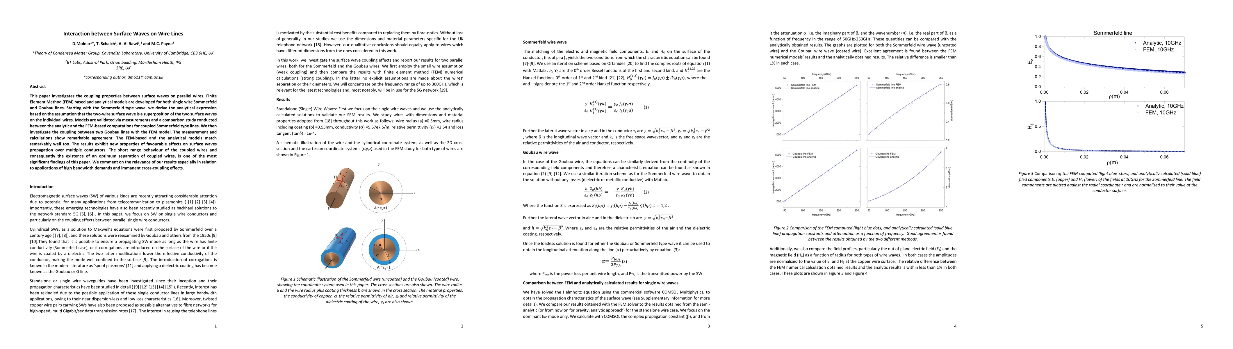 Researchers develop models to study coupling properties of surface waves on parallel wires, finding that optimal separation distances can improve wave propagation with favorable effects.