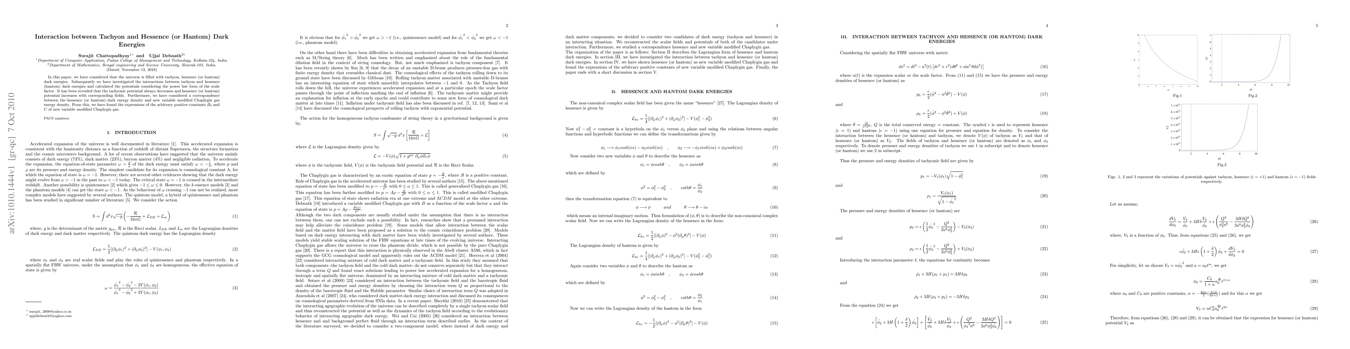 This paper explores interactions between tachyon and hessence (hantom) dark energies, revealing that tachyonic potential decreases while hessence potential increases. It also correlates hessence density with new variable modified Chaplygin gas density, deriving expressions for constants B0 and C.