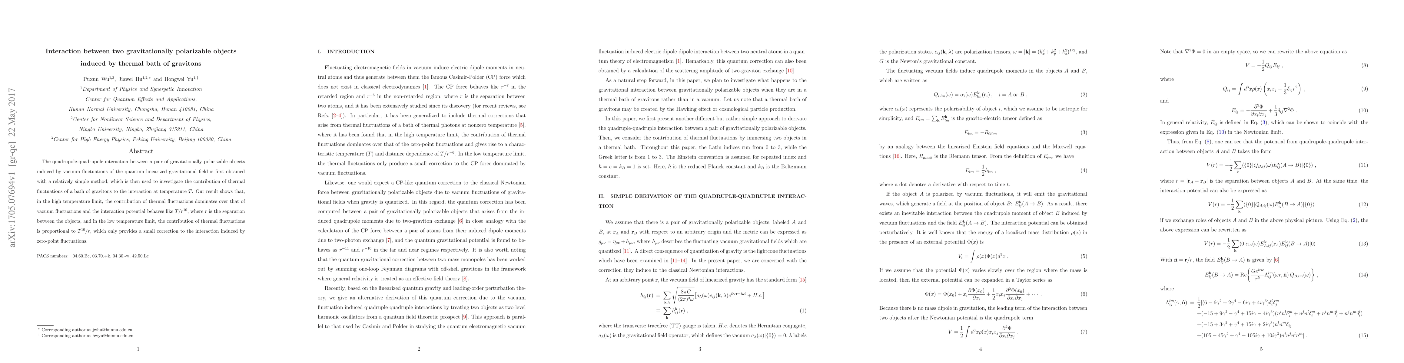 This paper derives the quadrupole-quadrupole interaction between gravitationally polarizable objects due to vacuum and thermal graviton fluctuations. It finds that thermal fluctuations dominate the interaction at high temperatures, leading to a $T/r^{10}$ potential, while at low temperatures, thermal effects provide a small correction to the vacuum fluctuation-induced interaction.
