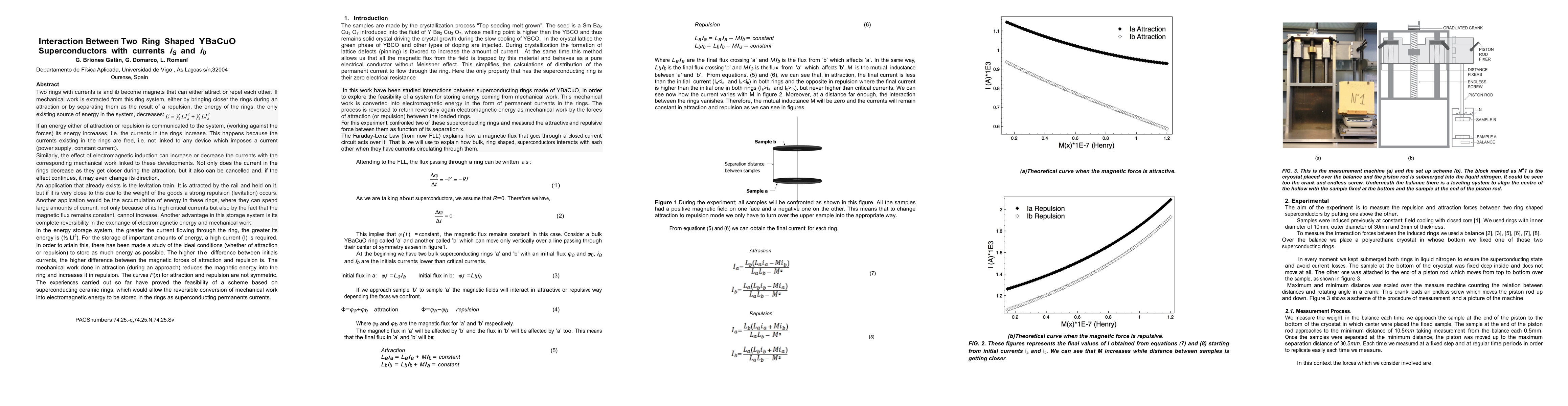 Two rings with currents ia and ib become magnets that can either attract or repel each other. If mechanical work is extracted from this ring system, either by bringing closer the rings during an attraction or by separating them as the result of a repulsion, the energy of the rings, the only existing source of energy in the system, decreases: $\frac{1}{2}LI_{a}^{2}+\frac{1}{2}LI_{b}^{2}$ If an energy either of attraction or repulsion is communicated to the system, (working against the forces) its energy increases, i.e. the currents in the rings increase. This happens because the currents existing in the rings are free, i.e. not linked to any device which imposes a current (power supply, constant current). Similarly, the effect of electromagnetic induction can increase or decrease the currents with the corresponding mechanical work linked to these developments. Not only does the current in the rings decrease as they get closer during the attraction, but it also can be cancelled and, if the effect continues, it may even change its direction. An application that already exists is the levitation train. It is attracted by the rail and held on it, but if it is very close to this due to the weight of the goods a strong repulsion (levitation) occurs. Another application would be the accumulation of energy in these rings, where they can spend large amounts of current, not only because of its high critical currents but also by the fact that the magnetic flux remains constant, cannot increase. Another advantage in this storage system is its reversibility in the exchange of electromagnetic energy and mechanical work. In the energy storage system, the greater the current flowing through the ring, the greater its energy is. In order to attain this, there has been made a study of the ideal conditions to store as much energy as possible.