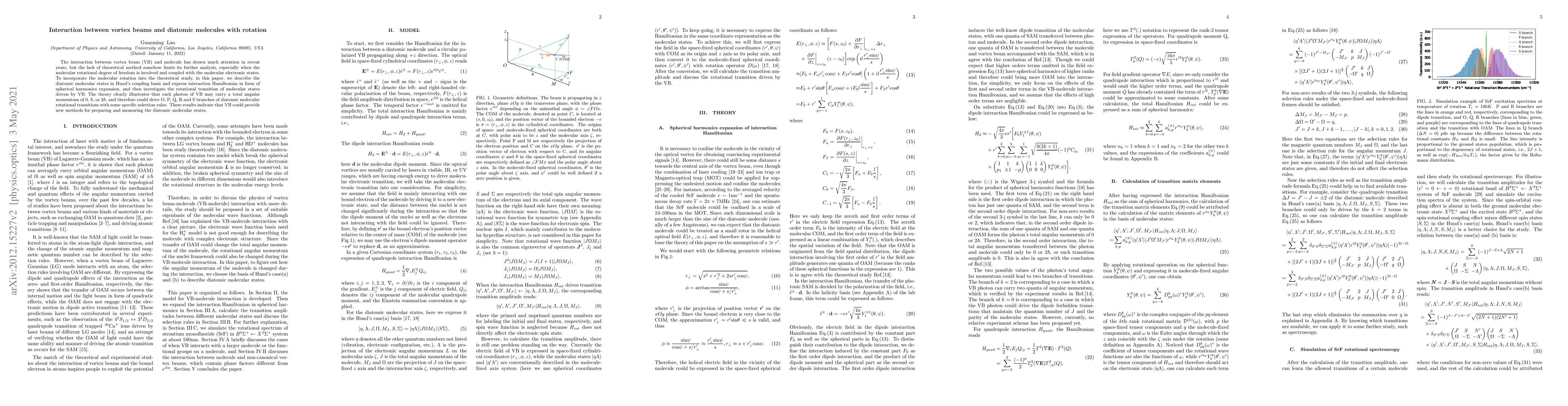 This paper develops a theoretical framework to analyze the interaction between vortex beams and rotating diatomic molecules, incorporating molecular rotation into the study. It reveals that vortex beams can drive various rotational transitions in diatomic molecules, offering new methods for preparing and measuring molecular states.