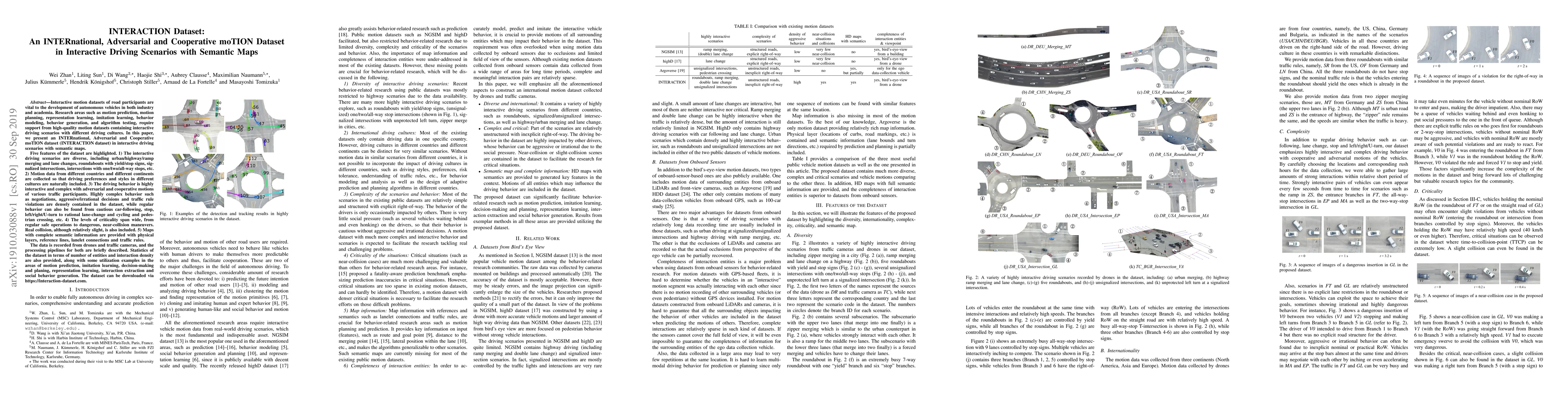 The INTERACTION dataset offers diverse, high-quality motion data for interactive driving scenarios across various cultures, featuring complex adversarial and cooperative behaviors, and complete semantic maps. It supports research in motion prediction, behavior modeling, and algorithm testing.