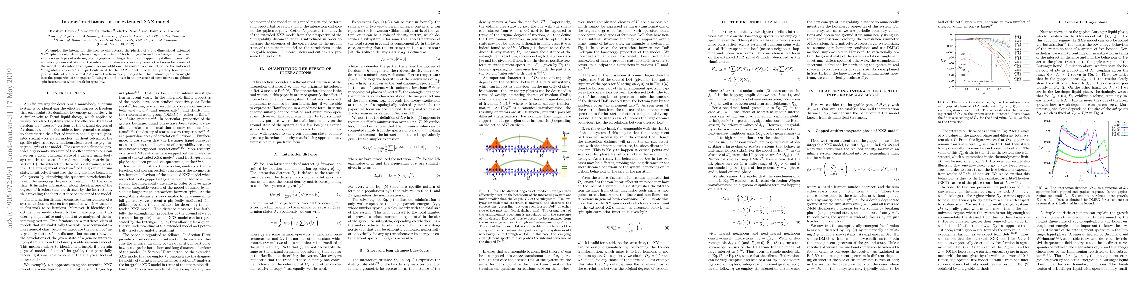 The interaction distance method successfully characterizes the physics of the extended XXZ model, distinguishing between integrable and non-integrable regimes, and provides a new tool to quantify how far its ground state is from being integrable.