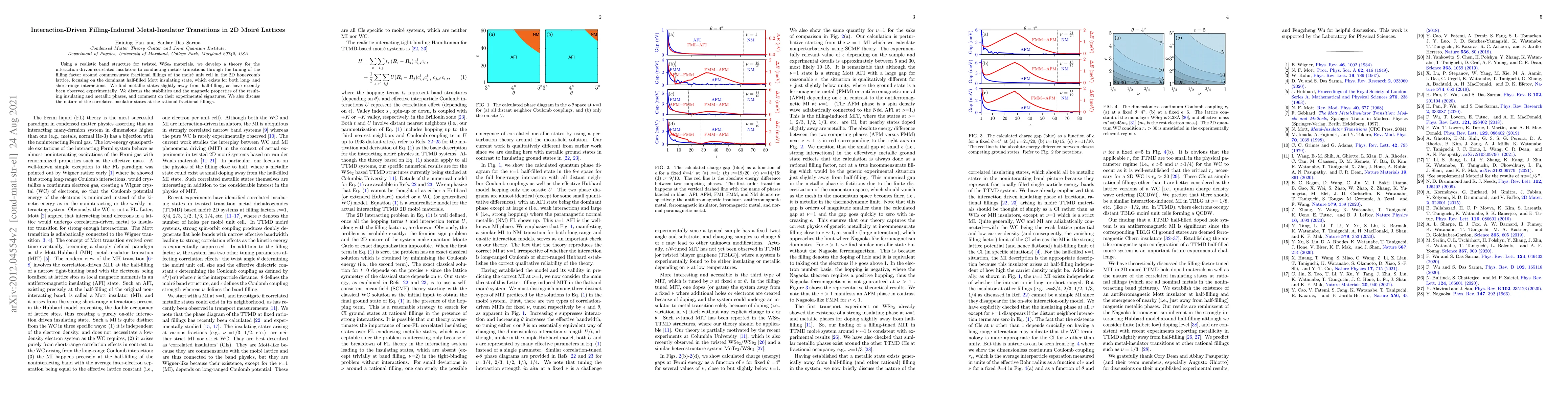 Using a realistic band structure for twisted WSe$_2 $ materials, we develop a theory for the interaction-driven correlated insulators to conducting metals transitions through the tuning of the filling factor around commensurate fractional fillings of the moir\'e unit cell in the 2D honeycomb lattice, focusing on the dominant half-filled Mott insulating state, which exists for both long- and short-range interactions. We find metallic states slightly away from half-filling, as have recently been observed experimentally. We discuss the stabilities and the magnetic properties of the resulting insulating and metallic phases, and comment on their experimental signatures. We also discuss the nature of the correlated insulator states at the rational fractional fillings.