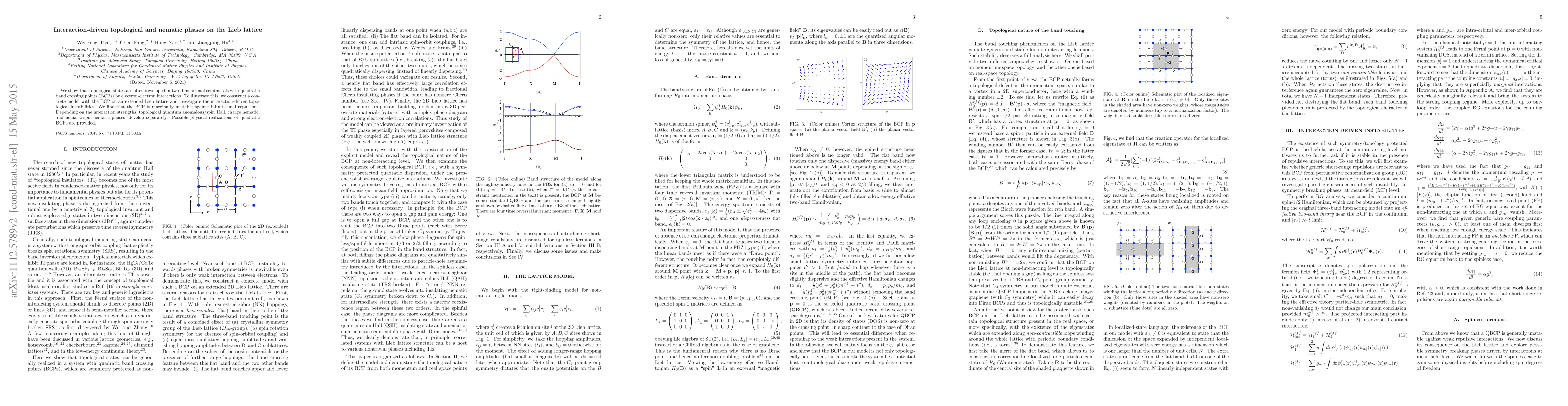 This paper demonstrates that electron-electron interactions can induce topological and nematic phases in two-dimensional semimetals with quadratic band crossing points on a Lieb lattice. It reveals the development of topological quantum anomalous/spin Hall, charge nematic, and nematic-spin-nematic phases depending on interaction strengths.