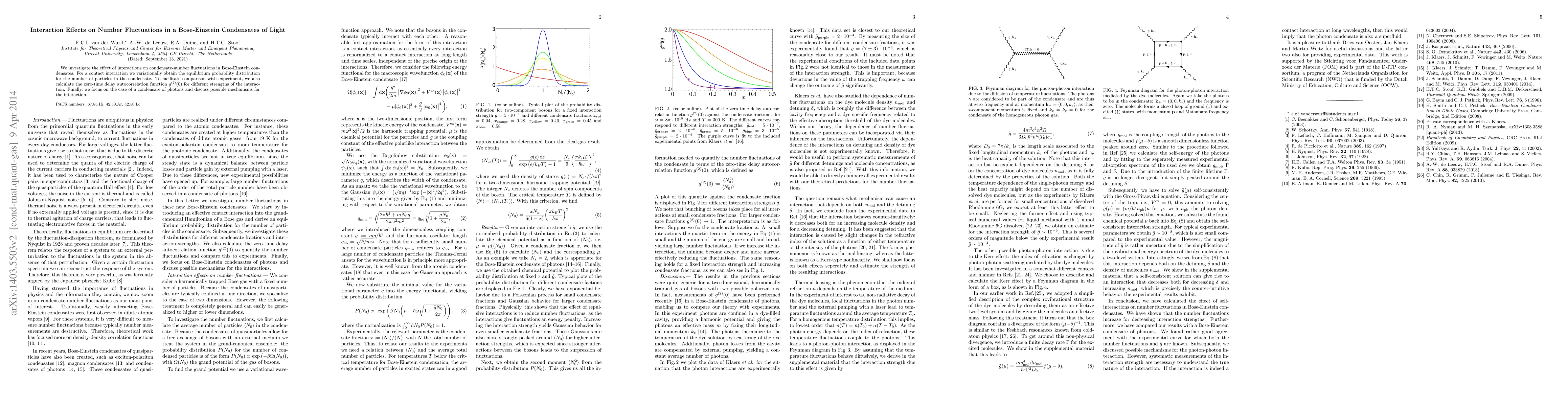 This paper examines how interactions influence number fluctuations in a Bose-Einstein condensate of light, deriving the equilibrium probability distribution for particle number and calculating the zero-time delay autocorrelation function $g^{(2)}(0)$. It specifically explores photon condensates and potential interaction mechanisms.