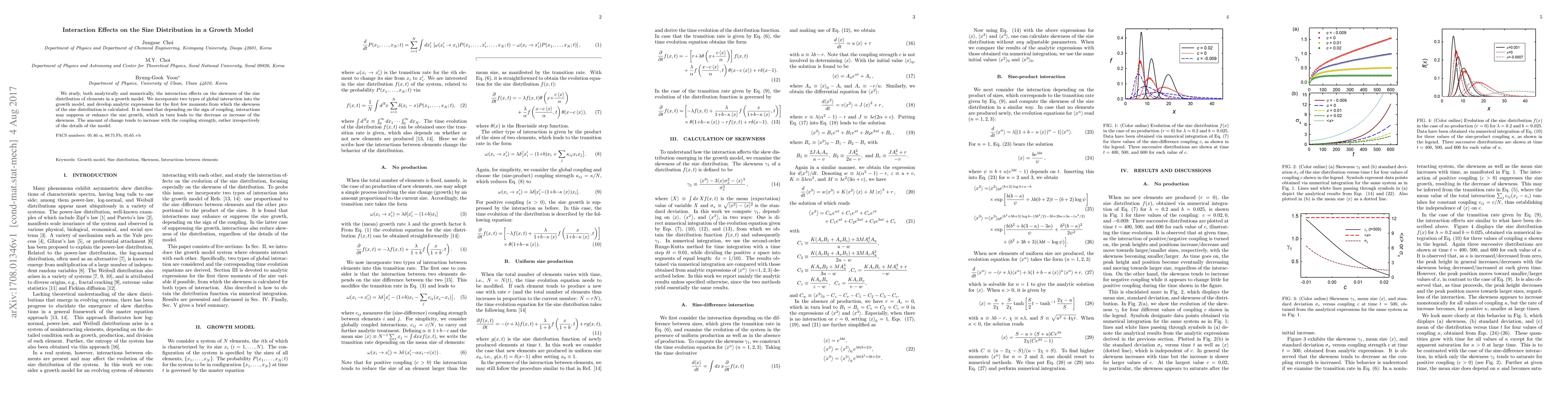 We study, both analytically and numerically, the interaction effects on the skewness of the size distribution of elements in a growth model. We incorporate two types of global interaction into the growth model, and develop analytic expressions for the first few moments from which the skewness of the size distribution is calculated. It is found that depending on the sign of coupling, interactions may suppress or enhance the size growth, which in turn leads to the decrease or increase of the skewness. The amount of change tends to increase with the coupling strength, rather irrespectively of the details of the model.