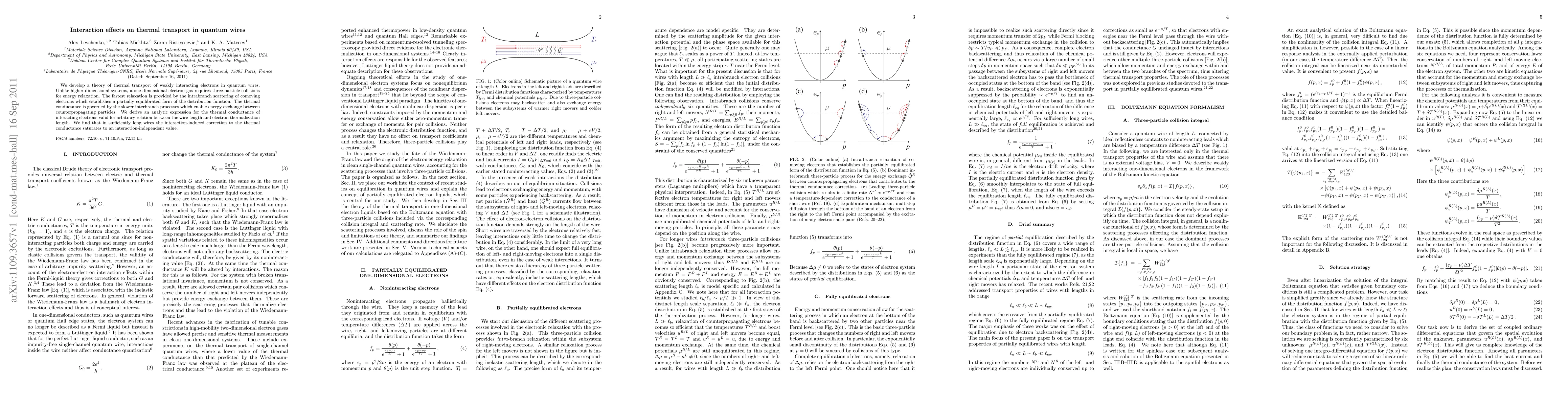 This paper develops a theoretical framework for thermal transport in quantum wires, showing that three-particle collisions are essential for energy relaxation in one-dimensional systems. The thermal conductance is primarily influenced by interbranch scattering processes, and the study finds that interactions lead to a saturation in thermal conductance in sufficiently long wires.