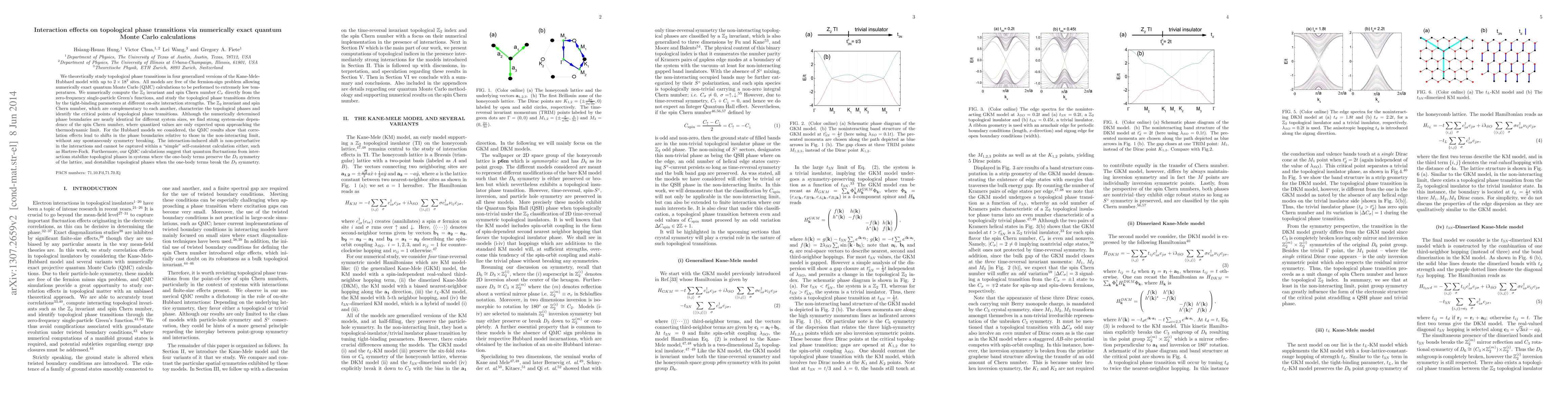 We theoretically study topological phase transitions in four generalized versions of the Kane-Mele-Hubbard model with up to $2\times 18^2$ sites. All models are free of the fermion-sign problem allowing numerically exact quantum Monte Carlo (QMC) calculations to be performed to extremely low temperatures. We numerically compute the $\mathbb{Z}_2$ invariant and spin Chern number $C_\sigma$ directly from the zero-frequency single-particle Green's functions, and study the topological phase transitions driven by the tight-binding parameters at different on-site interaction strengths. The $\mathbb{Z}_2$ invariant and spin Chern number, which are complementary to each another, characterize the topological phases and identify the critical points of topological phase transitions. Although the numerically determined phase boundaries are nearly identical for different system sizes, we find strong system-size dependence of the spin Chern number, where quantized values are only expected upon approaching the thermodynamic limit. For the Hubbard models we considered, the QMC results show that correlation effects lead to shifts in the phase boundaries relative to those in the non-interacting limit, without any spontaneously symmetry breaking. The interaction-induced shift is non-perturbative in the interactions and cannot be captured within a "simple" self-consistent calculation either, such as Hartree-Fock. Furthermore, our QMC calculations suggest that quantum fluctuations from interactions stabilize topological phases in systems where the one-body terms preserve the $D_3$ symmetry of the lattice, and destabilize topological phases when the one-body terms break the $D_3$ symmetry.