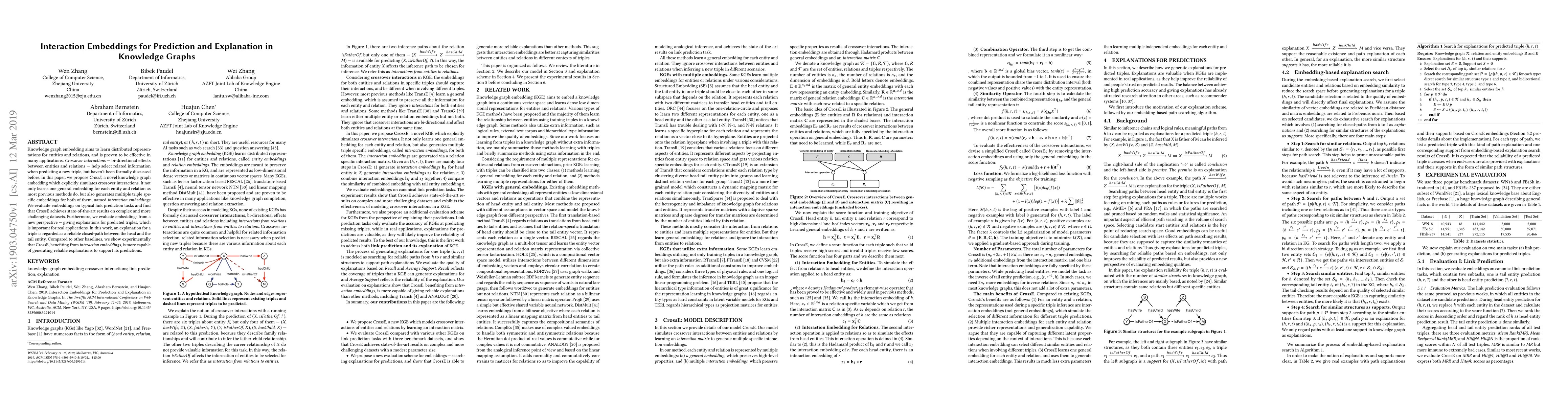 This paper introduces CrossE, a novel knowledge graph embedding method that explicitly simulates crossover interactions between entities and relations, generating multiple triple-specific embeddings. CrossE outperforms existing methods on link prediction tasks and provides more reliable explanations for predicted triples by identifying closed-path connections.