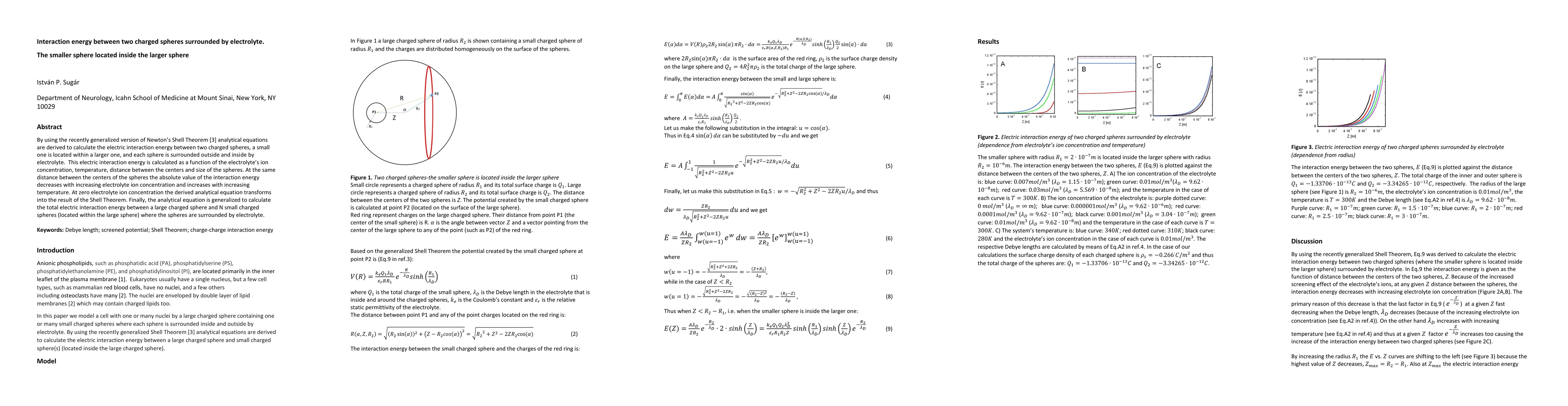 This paper derives analytical equations for the interaction energy between two charged spheres, one inside the other, both surrounded by electrolyte, using a generalized Newton Shell Theorem. The interaction energy varies with electrolyte concentration, temperature, and sphere size, and generalizes to multiple small spheres within a large one.
