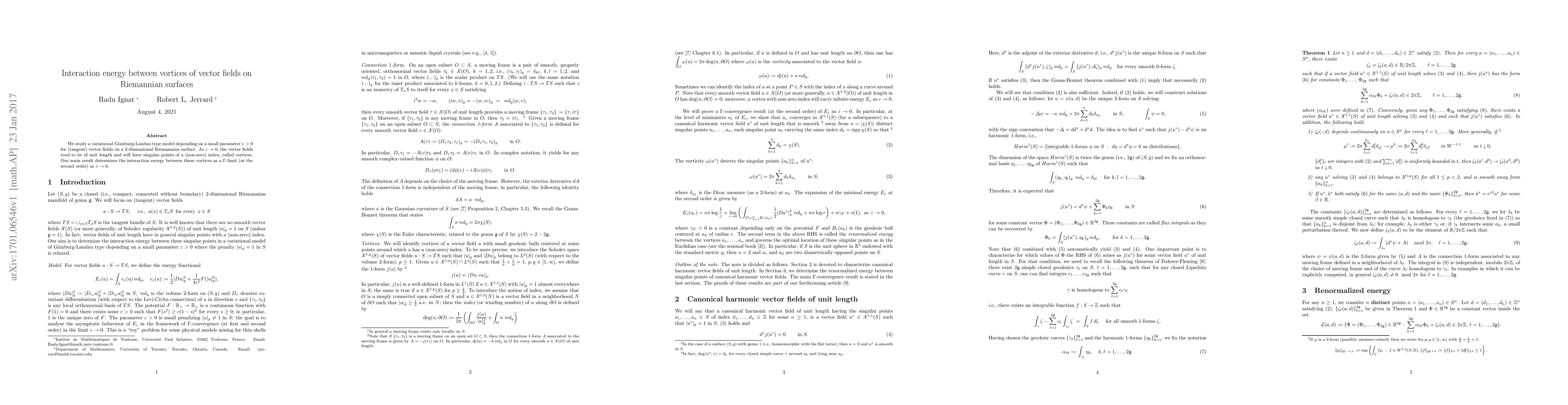 We study a variational Ginzburg-Landau type model depending on a small parameter $\epsilon>0$ for (tangent) vector fields on a $2$-dimensional Riemannian surface. As $\epsilon\to 0$, the vector fields tend to be of unit length and will have singular points of a (non-zero) index, called vortices. Our main result determines the interaction energy between these vortices as a $\Gamma$-limit (at the second order) as $\epsilon\to 0$.