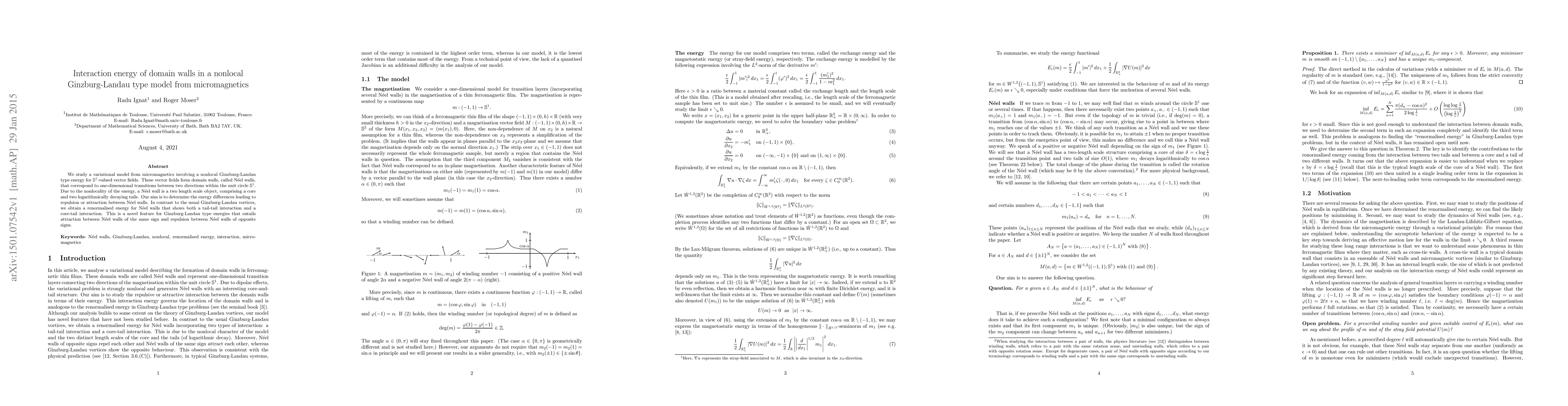 This paper investigates the interaction energy between Neel walls in a nonlocal Ginzburg-Landau model from micromagnetics, revealing a novel renormalised energy that accounts for both tail-tail and core-tail interactions, leading to attraction between like-sign walls and repulsion between opposite-sign walls.