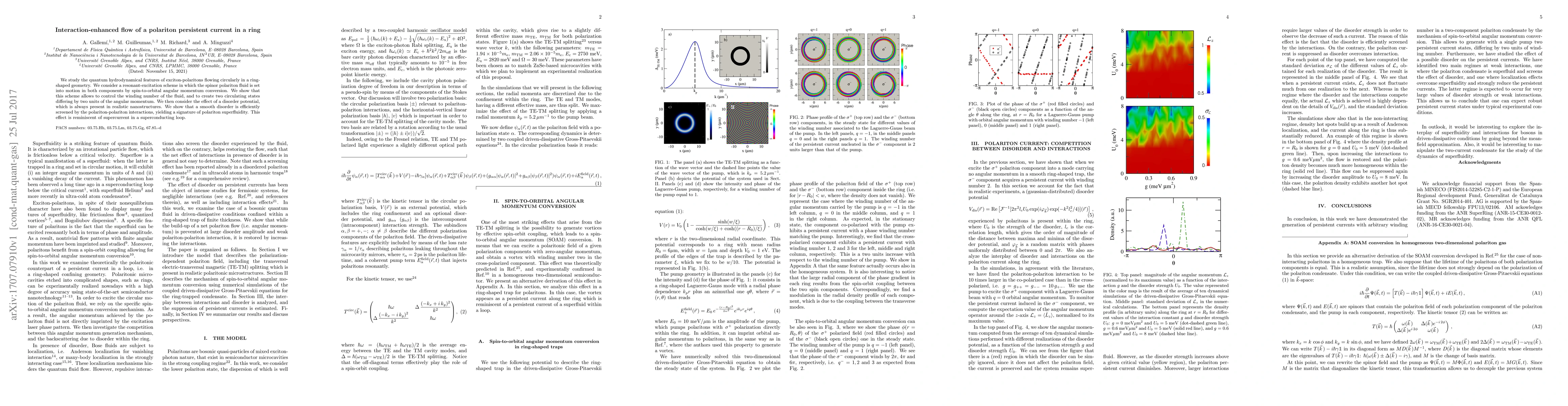 We study the quantum hydrodynamical features of exciton-polaritons flowing circularly in a ring-shaped geometry. We consider a resonant-excitation scheme in which the spinor polariton fluid is set into motion in both components by spin-to-orbital angular momentum conversion. We show that this scheme allows to control the winding number of the fluid, and to create two circulating states differing by two units of the angular momentum. We then consider the effect of a disorder potential, which is always present in realistic nanostructures. We show that a smooth disorder is efficiently screened by the polariton-polariton interactions, yielding a signature of polariton superfluidity. This effect is reminiscent of supercurrent in a superconducting loop.