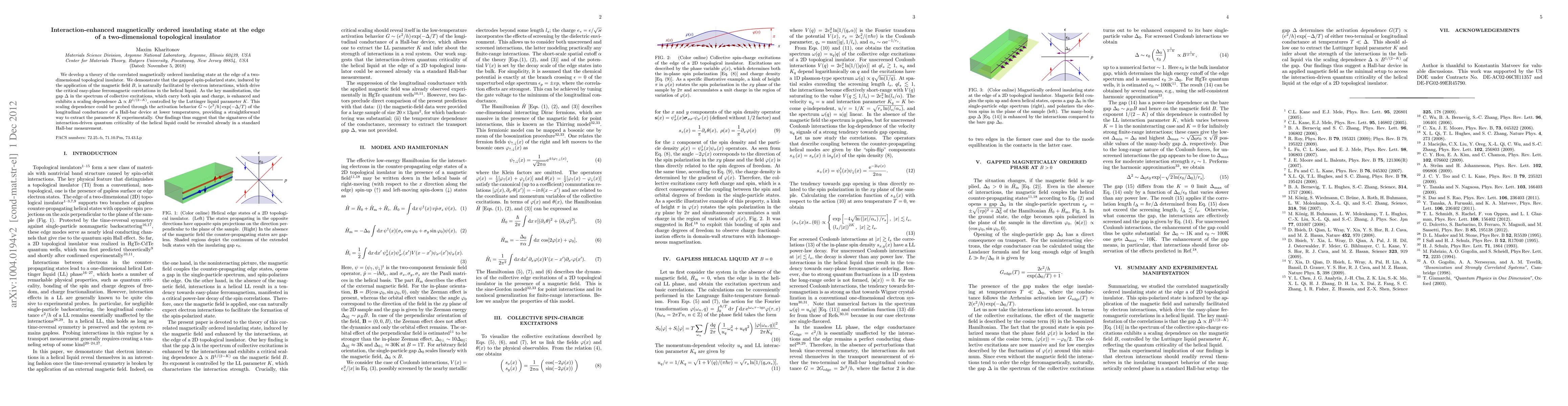 This paper develops a theoretical framework for a correlated magnetically ordered insulating state at the edge of a two-dimensional topological insulator, showing that electron interactions enhance the gap in collective excitations and propose a method to experimentally determine the Luttinger liquid parameter $K$ via the longitudinal conductance of a Hall-bar device.
