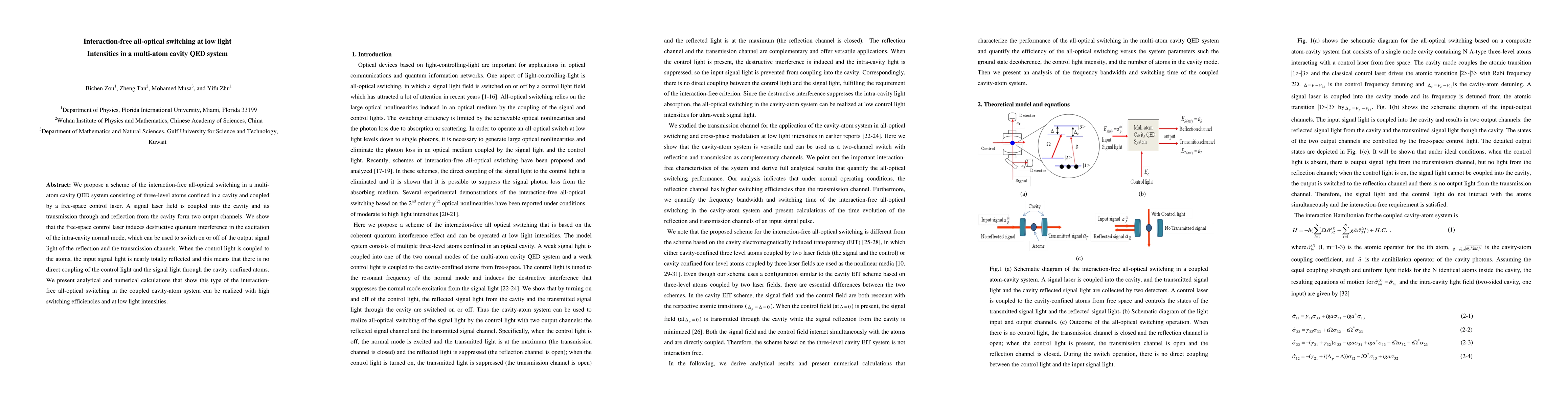 This paper proposes an interaction-free all-optical switching scheme in a multi-atom cavity QED system using a free-space control laser to induce destructive quantum interference, thereby controlling signal light transmission and reflection without direct coupling between control and signal light. Analytical and numerical results demonstrate high efficiency switching at low light intensities.