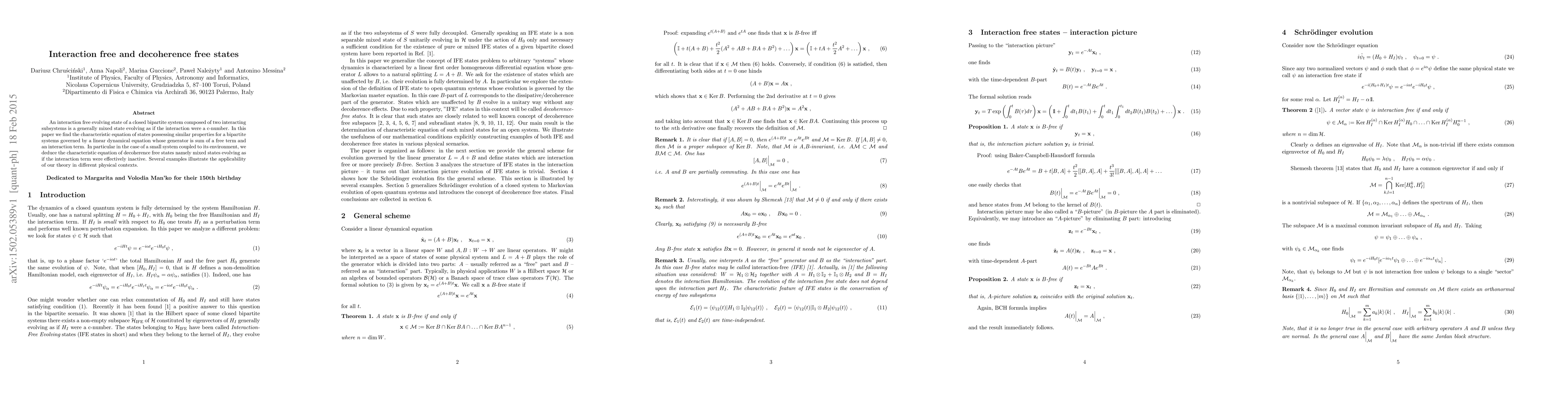 An interaction free evolving state of a closed bipartite system composed of two interacting subsystems is a generally mixed state evolving as if the interaction were a c-number. In this paper we find the characteristic equation of states possessing similar properties for a bipartite systems governed by a linear dynamical equation whose generator is sum of a free term and an interaction term. In particular in the case of a small system coupled to its environment, we deduce the characteristic equation of decoherence free states namely mixed states evolving as if the interaction term were effectively inactive. Several examples illustrate the applicability of our theory in different physical contexts.