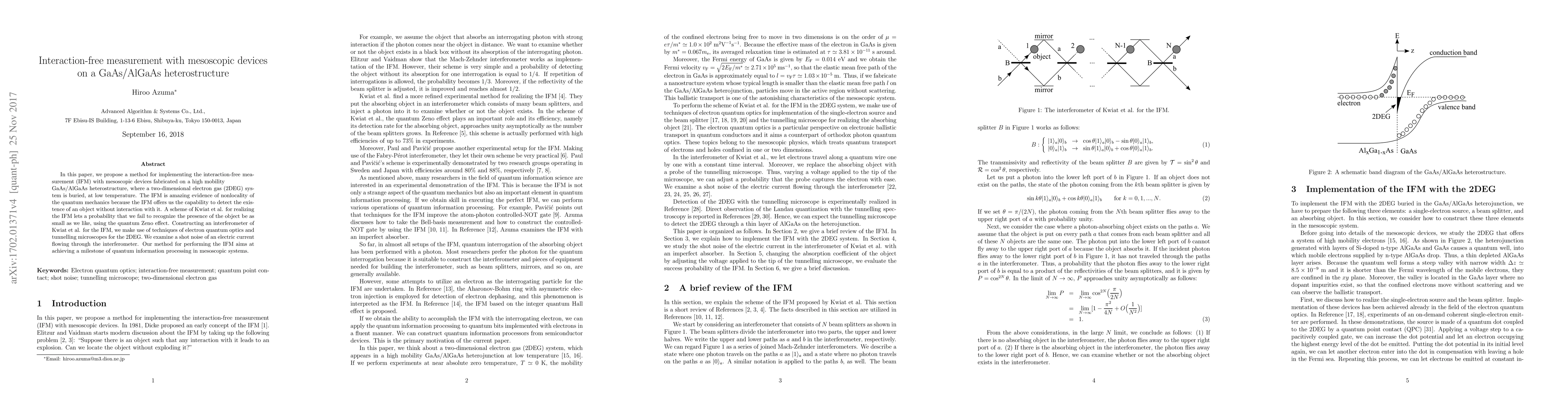 The research proposes a method for implementing interaction-free measurement (IFM) using mesoscopic devices on a GaAs/AlGaAs heterostructure, employing techniques of electron quantum optics and tunneling microscopes for a 2DEG system.