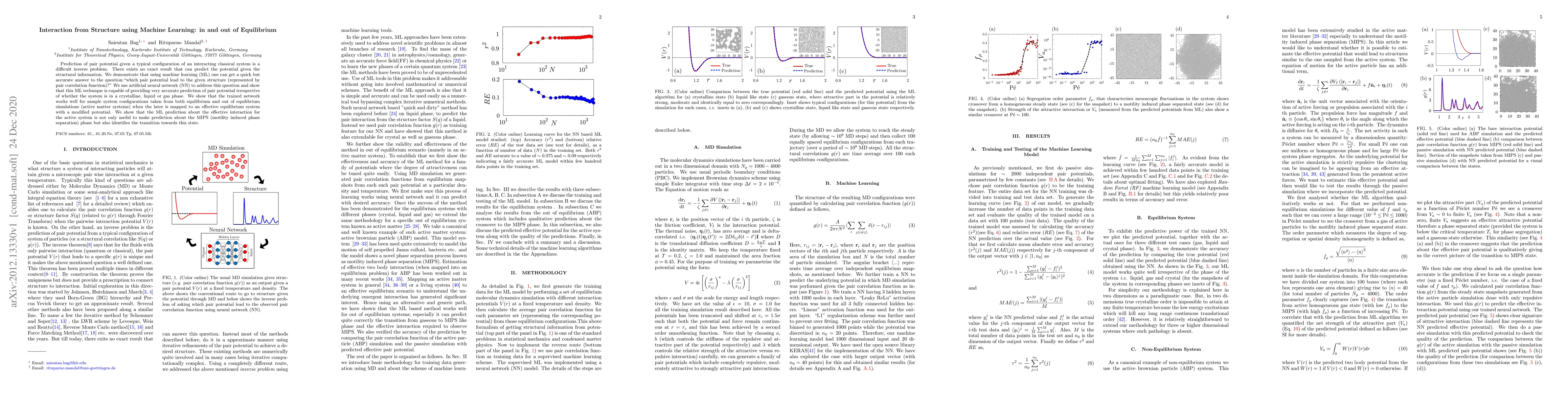 Prediction of pair potential given a typical configuration of an interacting classical system is a difficult inverse problem. There exists no exact result that can predict the potential given the structural information. We demonstrate that using machine learning (ML) one can get a quick but accurate answer to the question: which pair potential lead to the given structure (represented by pair correlation function)? We use artificial neural network (NN) to address this question and show that this ML technique is capable of providing very accurate prediction of pair potential irrespective of whether the system is in a crystalline, liquid or gas phase. We show that the trained network works well for sample system configurations taken from both equilibrium and out of equilibrium simulations (active matter systems) when the later is mapped to an effective equilibrium system with a modified potential. We show that the ML prediction about the effective interaction for the active system is not only useful to make prediction about the MIPS (motility induced phase separation) phase but also identifies the transition towards this state.