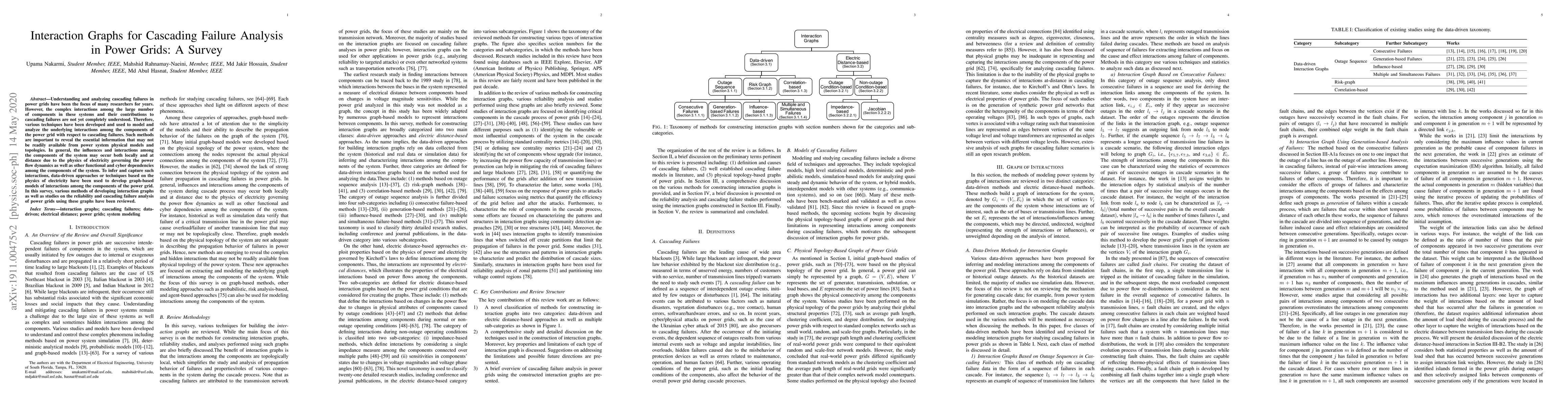 Understanding and analyzing cascading failures in power grids have been the focus of many researchers for years. However, the complex interactions among the large number of components in these systems and their contributions to cascading failures are not yet completely understood. Therefore, various techniques have been developed and used to model and analyze the underlying interactions among the components of the power grid with respect to cascading failures. Such methods are important to reveal the essential information that may not be readily available from power system physical models and topologies. In general, the influences and interactions among the components of the system may occur both locally and at distance due to the physics of electricity governing the power flow dynamics as well as other functional and cyber dependencies among the components of the system. To infer and capture such interactions, data-driven approaches or techniques based on the physics of electricity have been used to develop graph-based models of interactions among the components of the power grid. In this survey, various methods of developing interaction graphs as well as studies on the reliability and cascading failure analysis of power grids using these graphs have been reviewed.