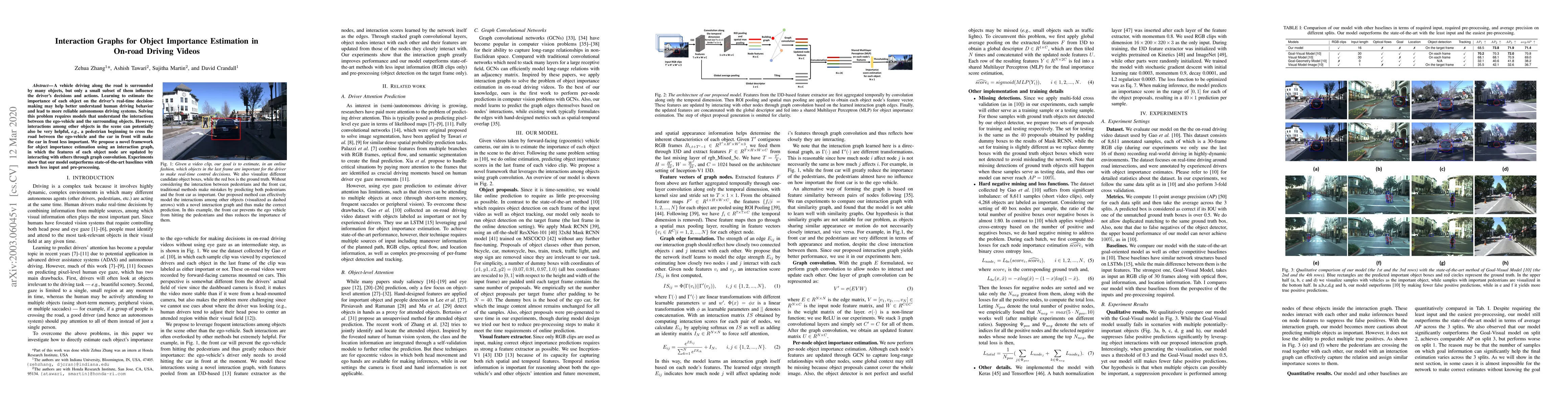 This paper proposes a novel framework using interaction graphs to estimate the importance of objects in on-road driving videos, updating object features through graph convolution to reflect interactions. The model outperforms existing methods, offering insights into human driving behavior and enhancing autonomous driving systems.