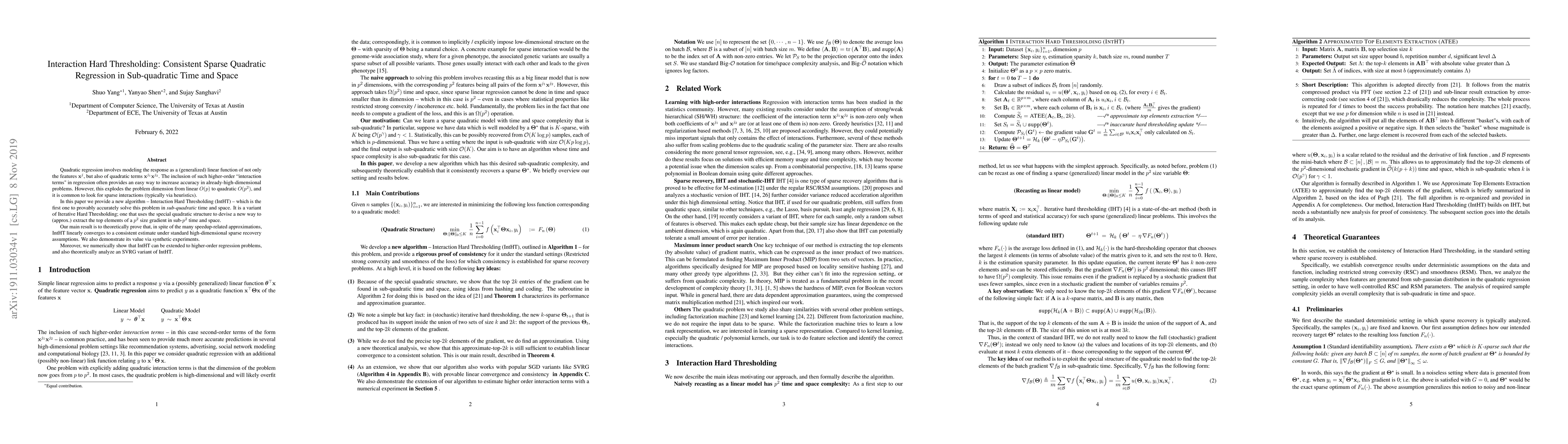 This paper introduces Interaction Hard Thresholding (IntHT), a novel algorithm that efficiently solves sparse quadratic regression problems in sub-quadratic time and space. It leverages the quadratic structure to extract significant interaction terms, theoretically proving linear convergence to a consistent estimate under high-dimensional sparse recovery conditions.