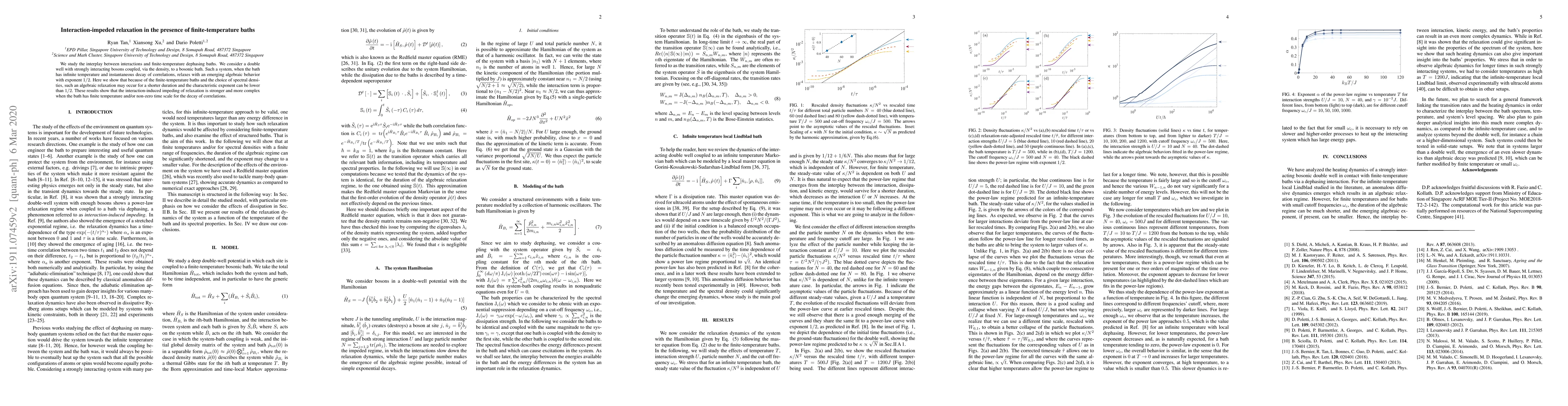 We study the interplay between interactions and finite-temperature dephasing baths. We consider a double well with strongly interacting bosons coupled, via the density, to a bosonic bath. Such a system, when the bath has infinite temperature and instantaneous decay of correlations, relaxes with an emerging algebraic behavior with exponent 1/2. Here we show that, because of the finite-temperature baths and of the choice of spectral densities, such an algebraic relaxation may occur for a shorter duration and the characteristic exponent can be lower than 1/2. These results show that the interaction-induced impeding of relaxation is stronger and more complex when the bath has finite temperature and/or nonzero timescale for the decay of correlations.