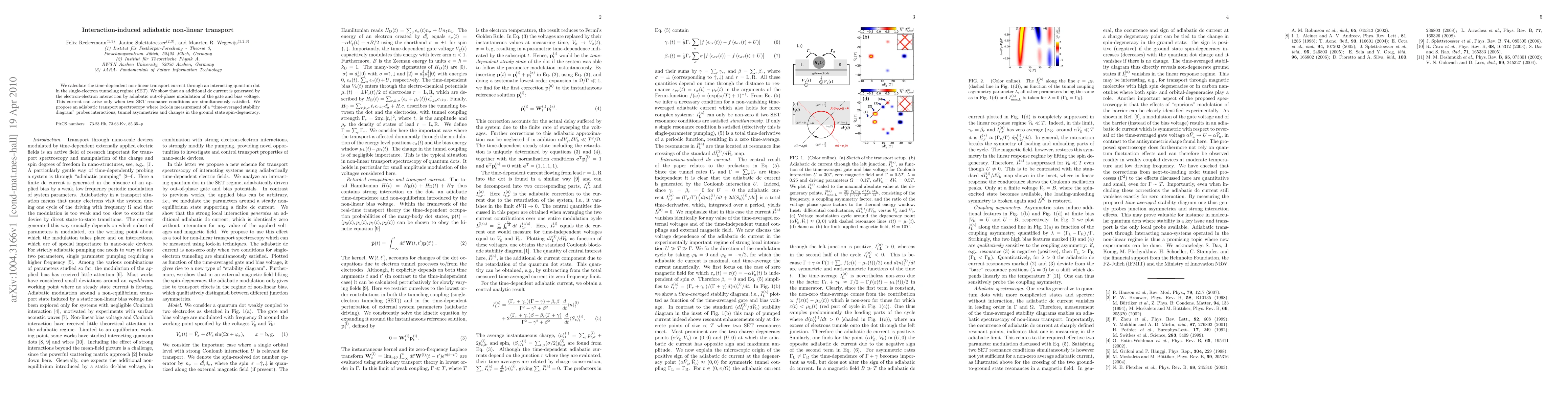 We calculate the time-dependent non-linear transport current through an interacting quantum dot in the single-electron tunneling regime (SET). We show that an additional dc current is generated by the electron-electron interaction by adiabatic out-of-phase modulation of the gate and bias voltage. This current can arise only when two SET resonance conditions are simultaneously satisfied. We propose an adiabatic transport spectroscopy where lock-in measurement of a "time-averaged stability diagram" probes interactions, tunnel asymmetries and changes in the ground state spin-degeneracy.