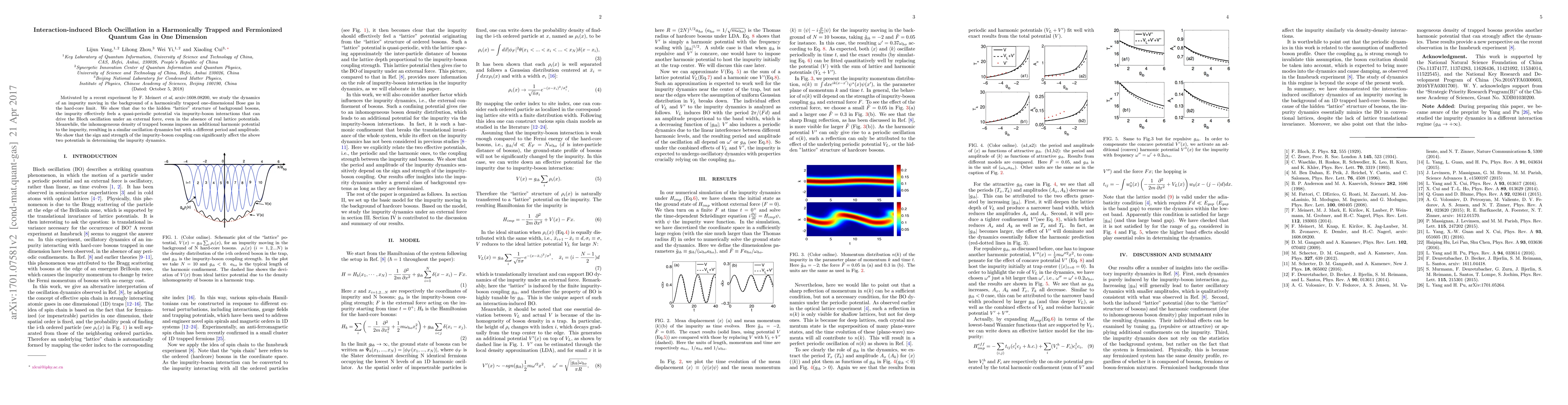 Motivated by a recent experiment by F. Meinert et al, arxiv:1608.08200, we study the dynamics of an impurity moving in the background of a harmonically trapped one-dimensional Bose gas in the hard-core limit. We show that due to the hidden "lattice" structure of background bosons, the impurity effectively feels a quasi-periodic potential via impurity-boson interactions that can drive the Bloch oscillation under an external force, even in the absence of real lattice potentials. Meanwhile, the inhomogeneous density of trapped bosons imposes an additional harmonic potential to the impurity, resulting in a similar oscillation dynamics but with different periods and amplitudes. We show that the sign and the strength of impurity-boson coupling can significantly affect above two potentials so as to determine the impurity dynamics.