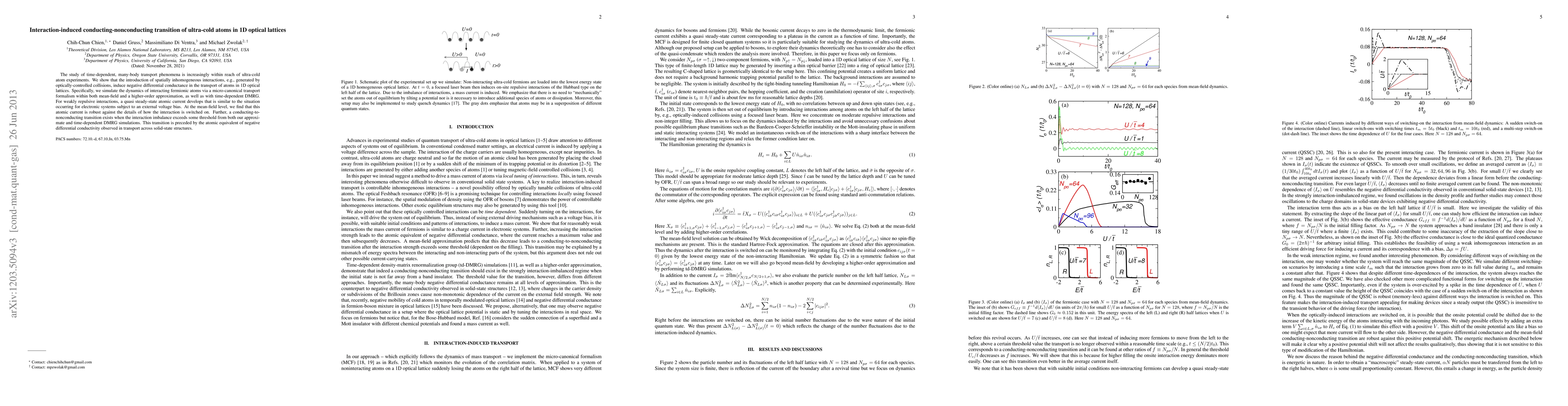 This paper investigates the conducting-nonconducting transition in ultra-cold atoms within 1D optical lattices induced by spatially inhomogeneous interactions. It demonstrates negative differential conductance and a conducting-to-nonconducting phase transition under specific interaction conditions, analogous to electronic systems.