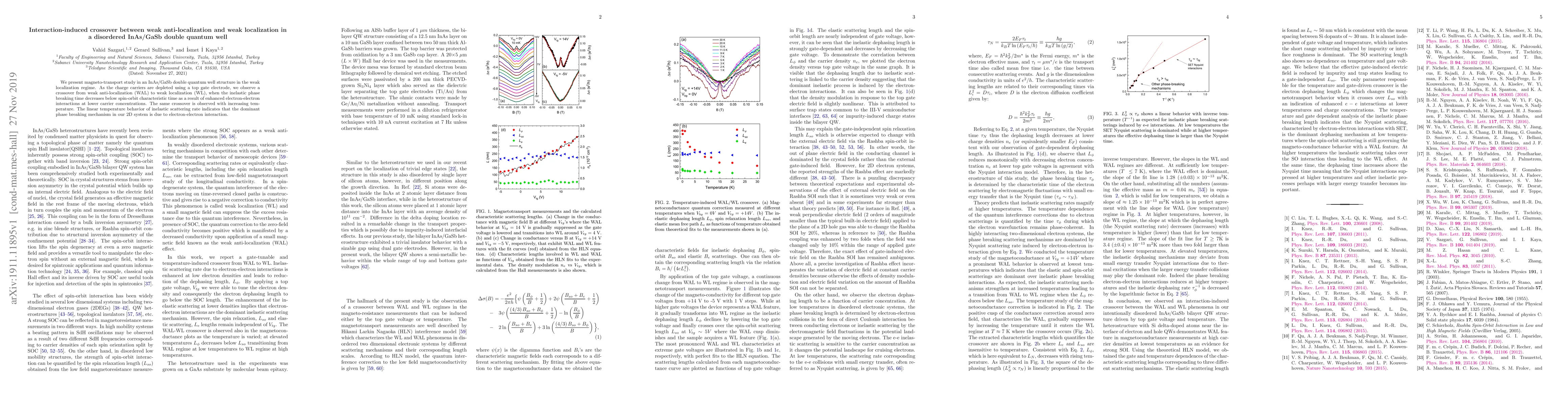 We present magneto-transport study in an InAs/GaSb double quantum well structure in the weak localization regime. As the charge carriers are depleted using a top gate electrode, we observe a crossover from weak anti-localization (WAL) to weak localization (WL), when the inelastic phase breaking time decreases below spin-orbit characteristic time as a result of enhanced electron-electron interactions at lower carrier concentrations. The same crossover is observed with increasing temperature. The linear temperature behavior of inelastic scattering rate indicates that the dominant phase breaking mechanism in our 2D system is due to electron-electron interaction.