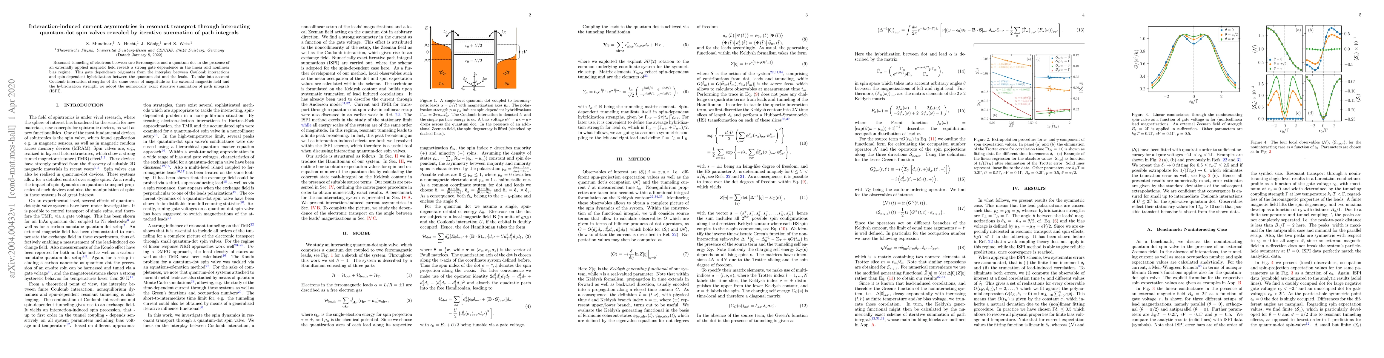 This paper investigates resonant electron tunneling in quantum-dot spin valves under an applied magnetic field, revealing current asymmetries due to Coulomb interactions and spin-dependent hybridization. The study employs iterative summation of path integrals to accurately account for strong Coulomb interactions.