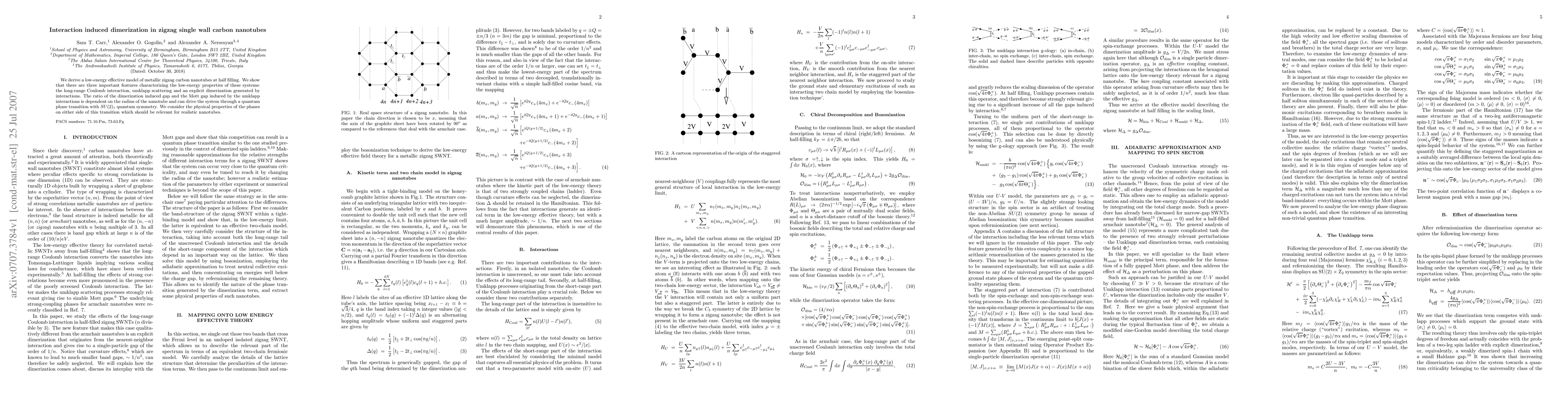 This paper explores the low-energy effective model of metallic zigzag carbon nanotubes, revealing dimerization induced by interactions and the influence of Coulomb interaction and umklapp scattering. The study finds that the ratio of dimerization-induced gap to the Mott gap varies with nanotube radius, potentially driving a quantum phase transition with SU(2)_1 quantum symmetry.