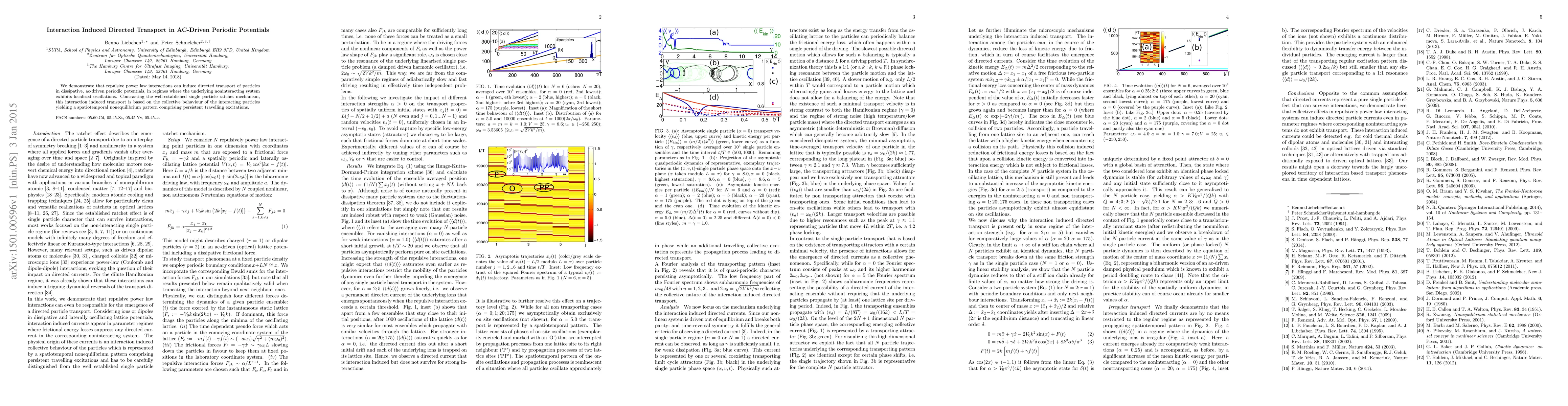We demonstrate that repulsive power law interactions can induce directed transport of particles in dissipative, ac-driven periodic potentials, in regimes where the underlying noninteracting system exhibits localized oscillations. Contrasting the well-established single particle ratchet mechanism, this interaction induced transport is based on the collective behaviour of the interacting particles yielding a spatiotemporal nonequilibrium pattern comprising persistent travelling excitations.