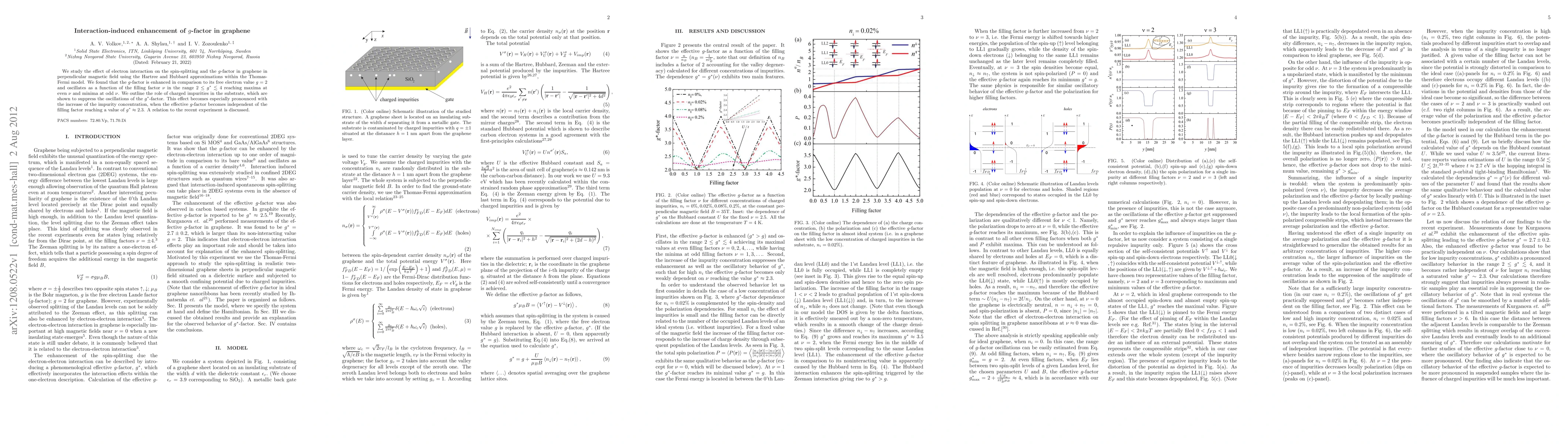 We study the effect of electron interaction on the spin-splitting and the $g$-factor in graphene in perpendicular magnetic field using the Hartree and Hubbard approximations within the Thomas-Fermi model. We found that the $g$-factor is enhanced in comparison to its free electron value $g=2$ and oscillates as a function of the filling factor $\nu $ in the range $2\leq g^{\ast}\lesssim 4$ reaching maxima at even $\nu $ and minima at odd $\nu $. We outline the role of charged impurities in the substrate, which are shown to suppress the oscillations of the $g^{\ast}$-factor. This effect becomes especially pronounced with the increase of the impurity concentration, when the effective $g$-factor becomes independent of the filling factor reaching a value of $g^{\ast}\approx 2.3$. A relation to the recent experiment is discussed.