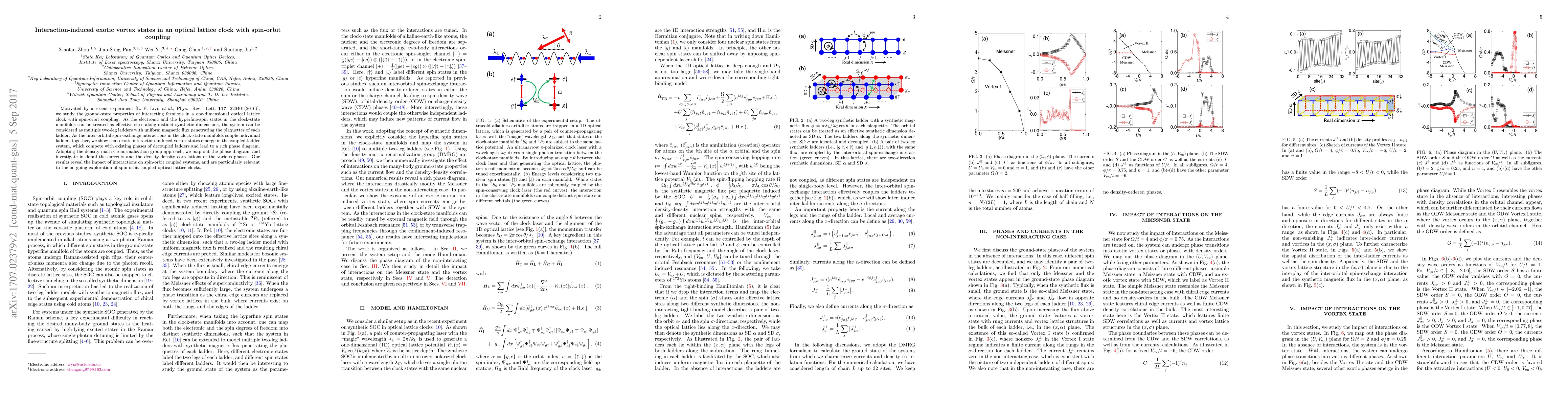 This paper investigates the ground-state properties of interacting fermions in a one-dimensional optical lattice clock with spin-orbit coupling, revealing exotic interaction-induced vortex states that emerge due to inter-orbital spin-exchange interactions. The study maps out a rich phase diagram using the density matrix renormalization group approach.