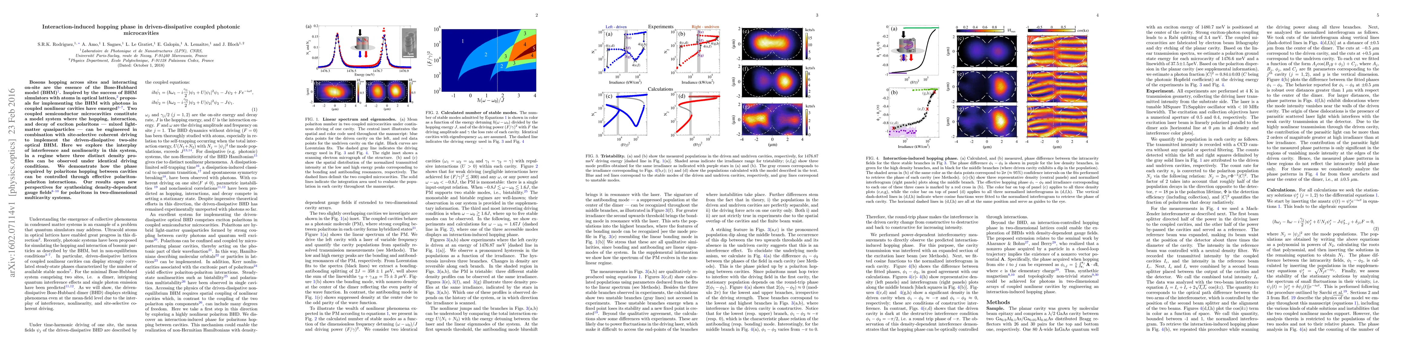 Bosons hopping across sites and interacting on-site are the essence of the Bose-Hubbard model (BHM). Inspired by the success of BHM simulators with atoms in optical lattices, proposals for implementing the BHM with photons in coupled nonlinear cavities have emerged. Two coupled semiconductor microcavities constitute a model system where the hopping, interaction, and decay of exciton polaritons --- mixed light-matter quasiparticles --- can be engineered in combination with site-selective coherent driving to implement the driven-dissipative two-site optical BHM. Here we explore the interplay of interference and nonlinearity in this system, in a regime where three distinct density profiles can be observed under identical driving conditions. We demonstrate how the phase acquired by polaritons hopping between cavities can be controlled through effective polariton-polariton interactions. Our results open new perspectives for synthesizing density-dependent gauge fields for polaritons in two-dimensional multicavity systems.