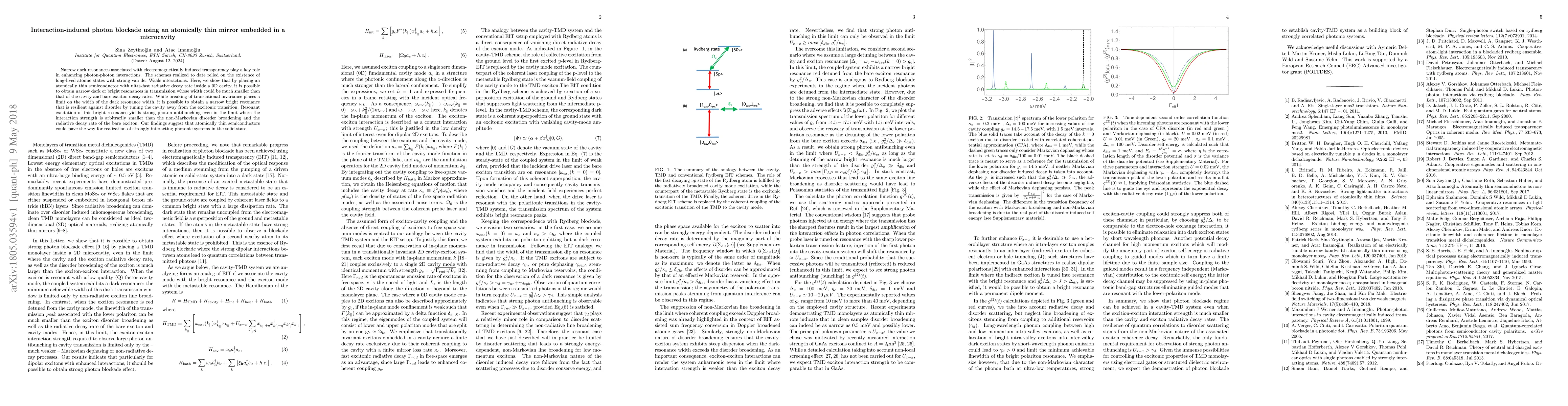 This paper demonstrates the interaction-induced photon blockade using an atomically thin semiconductor embedded in a microcavity, achieving narrow dark or bright resonances. The study shows that resonant excitation of a bright resonance can yield strong photon antibunching, suggesting atomically thin semiconductors could enable strongly interacting photonic systems in solid-state.