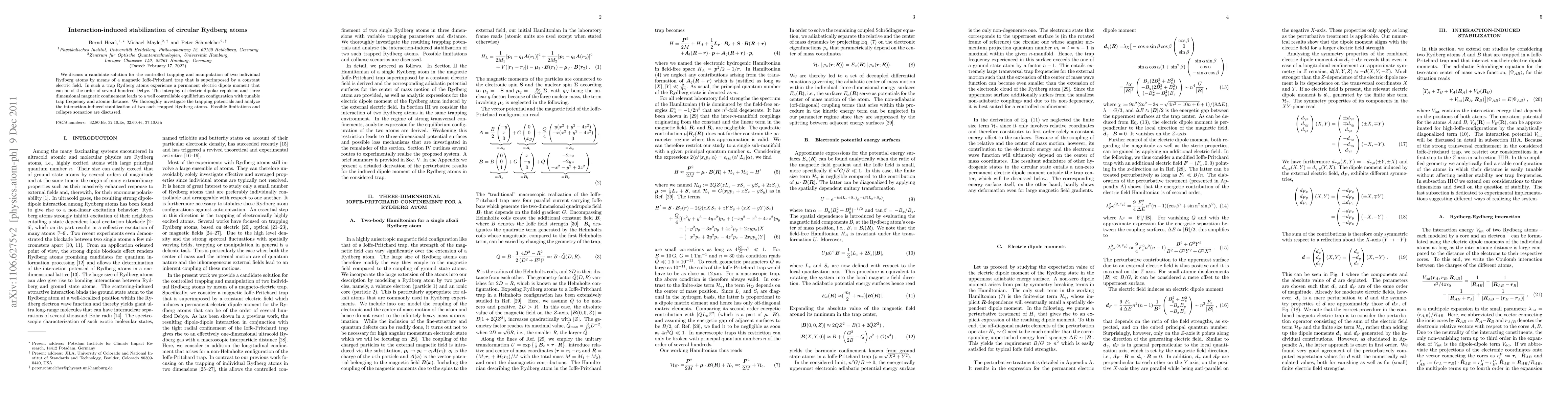 We discuss a candidate solution for the controlled trapping and manipulation of two individual Rydberg atoms by means of a magnetic Ioffe-Pritchard trap that is superimposed by a constant electric field. In such a trap Rydberg atoms experience a permanent electric dipole moment that can be of the order of several hundred Debye. The interplay of electric dipolar repulsion and three dimensional magnetic confinement leads to a well controllable equilibrium configuration with tunable trap frequency and atomic distance. We thoroughly investigate the trapping potentials and analyze the interaction-induced stabilization of two such trapped Rydberg atoms. Possible limitations and collapse scenarios are discussed.