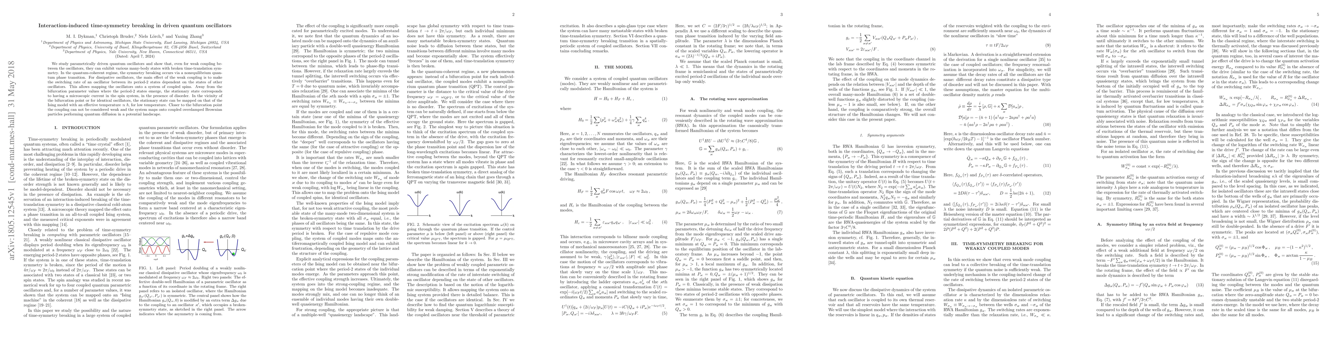 This paper investigates parametrically driven quantum oscillators, demonstrating that weak coupling can lead to broken time-translation symmetry through a nonequilibrium quantum phase transition in the quantum-coherent regime. For dissipative oscillators, coupling influences the switching rate between period-2 states, mapping them onto a system of coupled spins with a microscopic current in the presence of disorder.