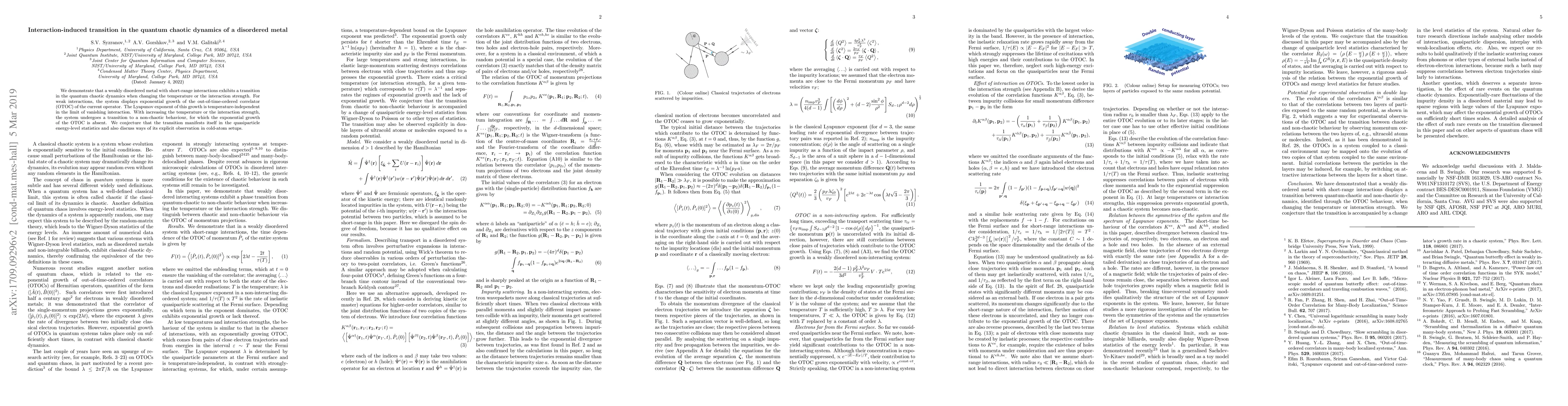 We demonstrate that a weakly disordered metal with short-range interactions exhibits a transition in the quantum chaotic dynamics when changing the temperature or the interaction strength. For weak interactions, the system displays exponential growth of the out-of-time-ordered correlator (OTOC) of the current operator. The Lyapunov exponent of this growth is temperature-independent in the limit of vanishing interaction. With increasing the temperature or the interaction strength, the system undergoes a transition to a non-chaotic behaviour, for which the exponential growth of the OTOC is absent. We conjecture that the transition manifests itself in the quasiparticle energy-level statistics and also discuss ways of its explicit observation in cold-atom setups.