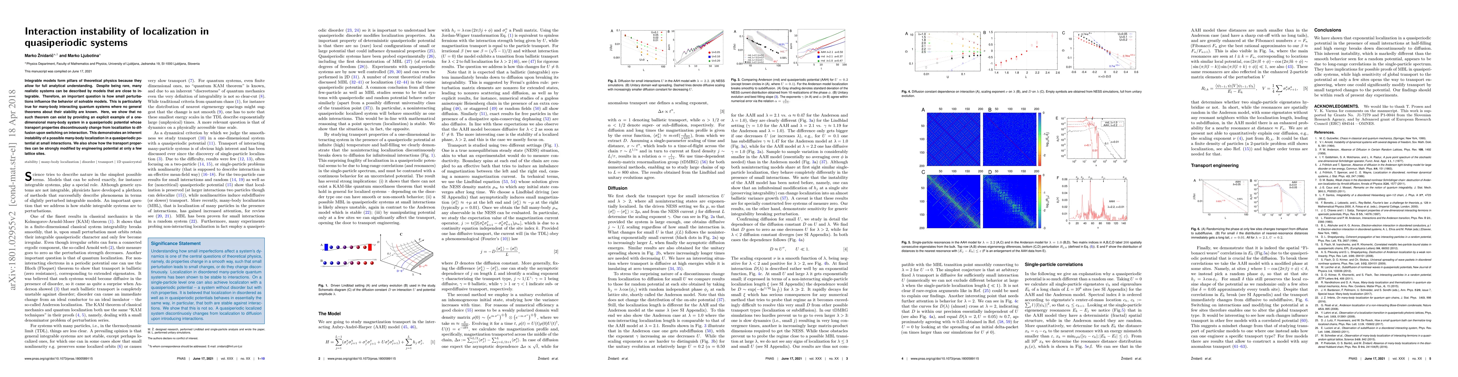 Integrable models form pillars of theoretical physics because they allow for full analytical understanding. Despite being rare, many realistic systems can be described by models that are close to integrable. Therefore, an important question is how small perturbations influence the behavior of solvable models. This is particularly true for many-body interacting quantum systems where no general theorems about their stability are known. Here, we show that no such theorem can exist by providing an explicit example of a one-dimensional many-body system in a quasiperiodic potential whose transport properties discontinuously change from localization to diffusion upon switching on interaction. This demonstrates an inherent instability of a possible many-body localization in a quasiperiodic potential at small interactions. We also show how the transport properties can be strongly modified by engineering potential at only a few lattice sites.