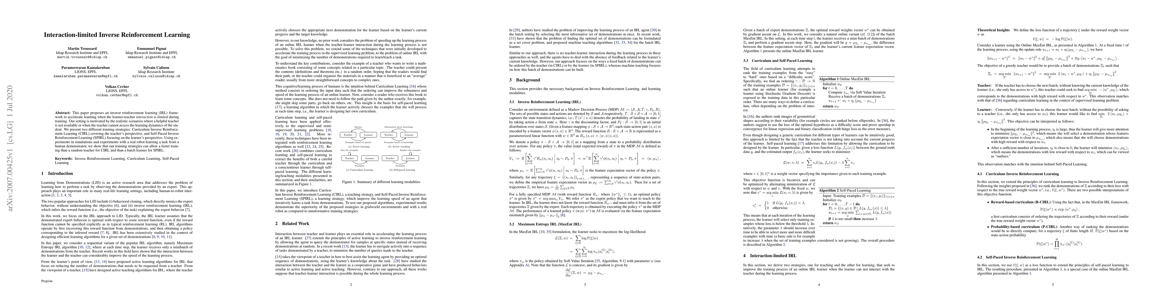 This paper proposes an inverse reinforcement learning (IRL) framework to accelerate learning when the learner-teacher \textit{interaction} is \textit{limited} during training. Our setting is motivated by the realistic scenarios where a helpful teacher is not available or when the teacher cannot access the learning dynamics of the student. We present two different training strategies: Curriculum Inverse Reinforcement Learning (CIRL) covering the teacher's perspective, and Self-Paced Inverse Reinforcement Learning (SPIRL) focusing on the learner's perspective. Using experiments in simulations and experiments with a real robot learning a task from a human demonstrator, we show that our training strategies can allow a faster training than a random teacher for CIRL and than a batch learner for SPIRL.