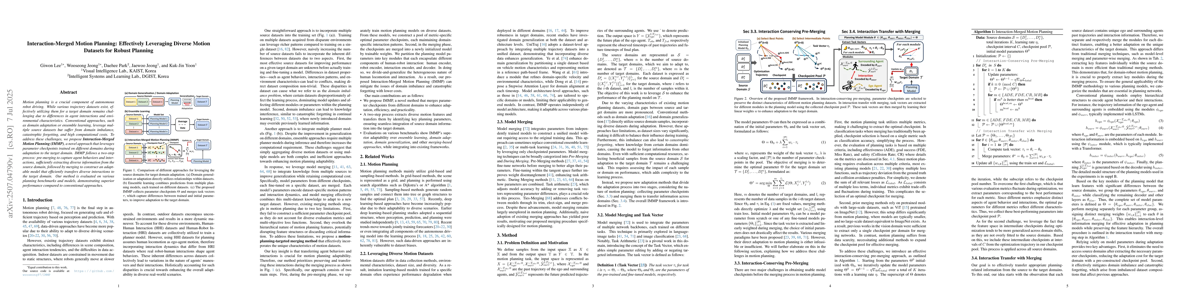 Motion planning is a crucial component of autonomous robot driving. While various trajectory datasets exist, effectively utilizing them for a target domain remains challenging due to differences in agent interactions and environmental characteristics. Conventional approaches, such as domain adaptation or ensemble learning, leverage multiple source datasets but suffer from domain imbalance, catastrophic forgetting, and high computational costs. To address these challenges, we propose Interaction-Merged Motion Planning (IMMP), a novel approach that leverages parameter checkpoints trained on different domains during adaptation to the target domain. IMMP follows a two-step process: pre-merging to capture agent behaviors and interactions, sufficiently extracting diverse information from the source domain, followed by merging to construct an adaptable model that efficiently transfers diverse interactions to the target domain. Our method is evaluated on various planning benchmarks and models, demonstrating superior performance compared to conventional approaches.