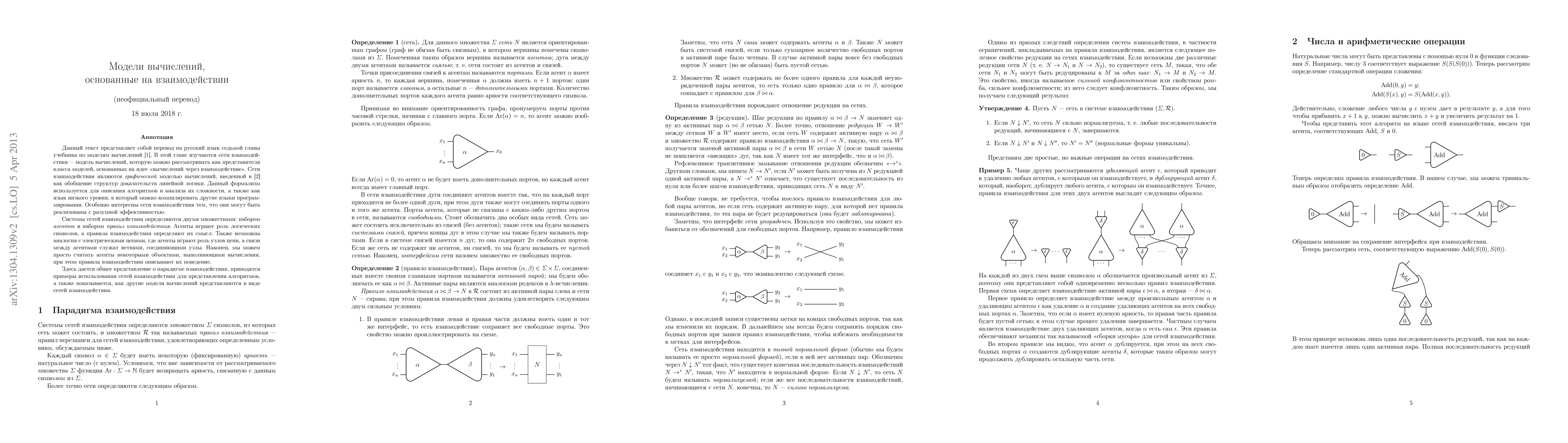 Draft translation to Russian of Chapter 7, Interaction-Based Models of Computation, from Models of Computation: An Introduction to Computability Theory by Maribel Fernandez. "In this chapter, we study interaction nets, a model of computation that can be seen as a representative of a class of models based on the notion of 'computation as interaction'. Interaction nets are a graphical model of computation devised by Yves Lafont in 1990 as a generalisation of the proof structures of linear logic. It can be seen as an abstract formalism, used to define algorithms and analyse their cost, or as a low-level language into which other programming languages can be compiled. This is fruitful because interaction nets can be implemented with reasonable efficiency."