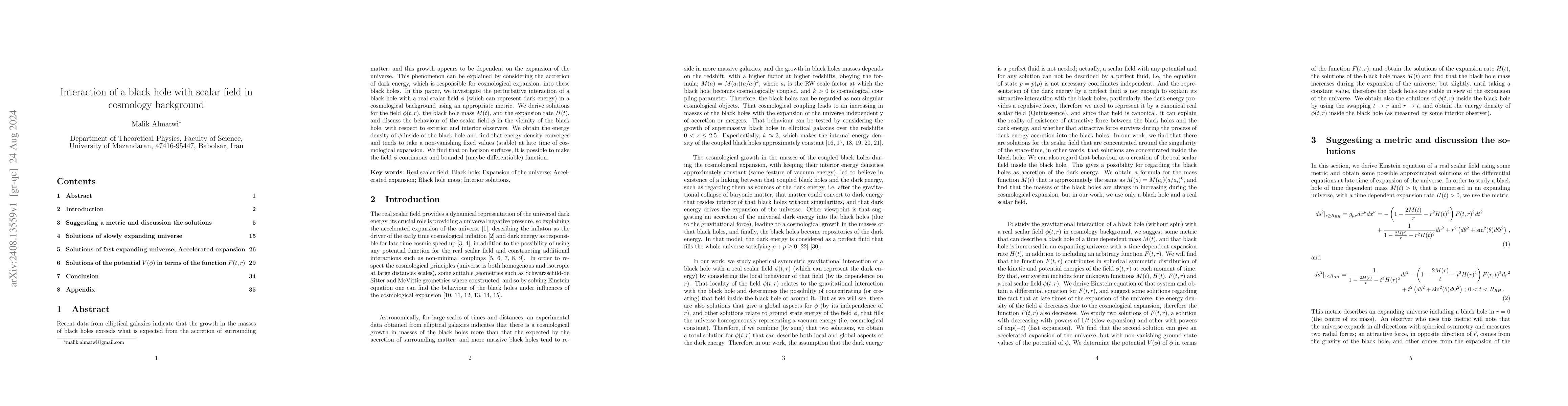 Recent data from elliptical galaxies indicate that the growth in the masses of black holes exceeds what is expected from the accretion of surrounding matter, and this growth appears to be dependent on the expansion of the universe. This phenomenon can be explained by considering the accretion of dark energy, which is responsible for cosmological expansion, into these black holes. In this paper, we investigate the perturbative interaction of a black hole with a real scalar field $\phi$ (which can represent dark energy) in a cosmological background using an appropriate metric. We derive solutions for the field $\phi(t, r)$, the black hole mass $M(t)$, and the expansion rate $H(t)$, and discuss the behaviour of the scalar field $\phi$ in the vicinity of the black hole, with respect to exterior and interior observers. We obtain the energy density of $\phi$ inside of the black hole and find that energy density converges and tends to take a non-vanishing fixed values (stable) at late time of cosmological expansion. We find that on horizon surfaces, it is possible to make the field $\phi$ continuous and bounded (maybe differentiable) function.