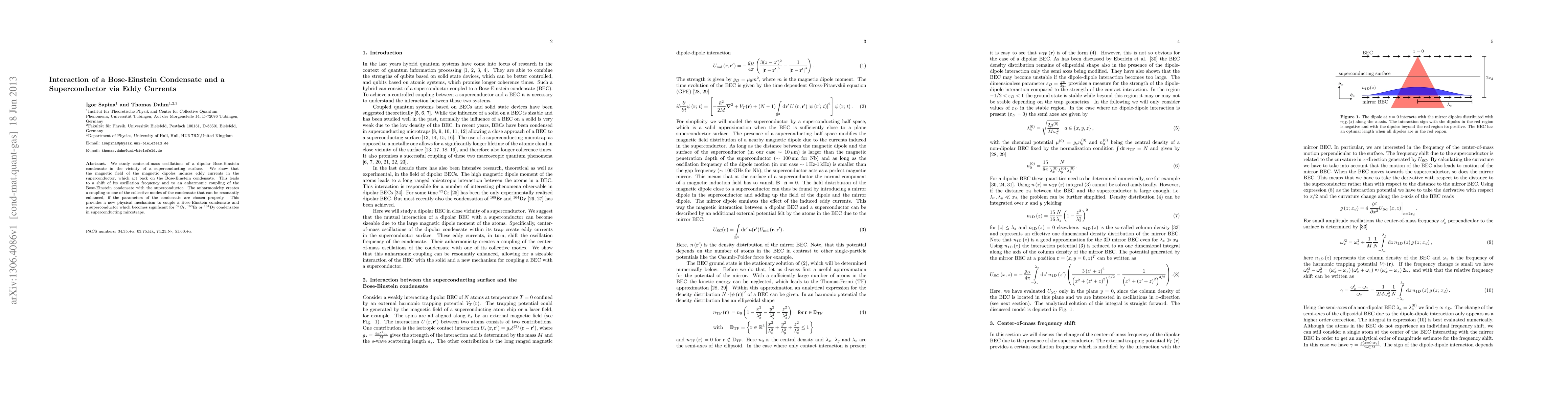 We study center-of-mass oscillations of a dipolar Bose-Einstein condensate in the vicinity of a superconducting surface. We show that the magnetic field of the magnetic dipoles induces eddy currents in the superconductor, which act back on the Bose-Einstein condensate. This leads to a shift of its oscillation frequency and to an anharmonic coupling of the Bose-Einstein condensate with the superconductor. The anharmonicity creates a coupling to one of the collective modes of the condensate that can be resonantly enhanced, if the parameters of the condensate are chosen properly. This provides a new physical mechanism to couple a Bose-Einstein condensate and a superconductor which becomes significant for 52Cr, 168Er or 164Dy condensates in superconducting mircotraps.