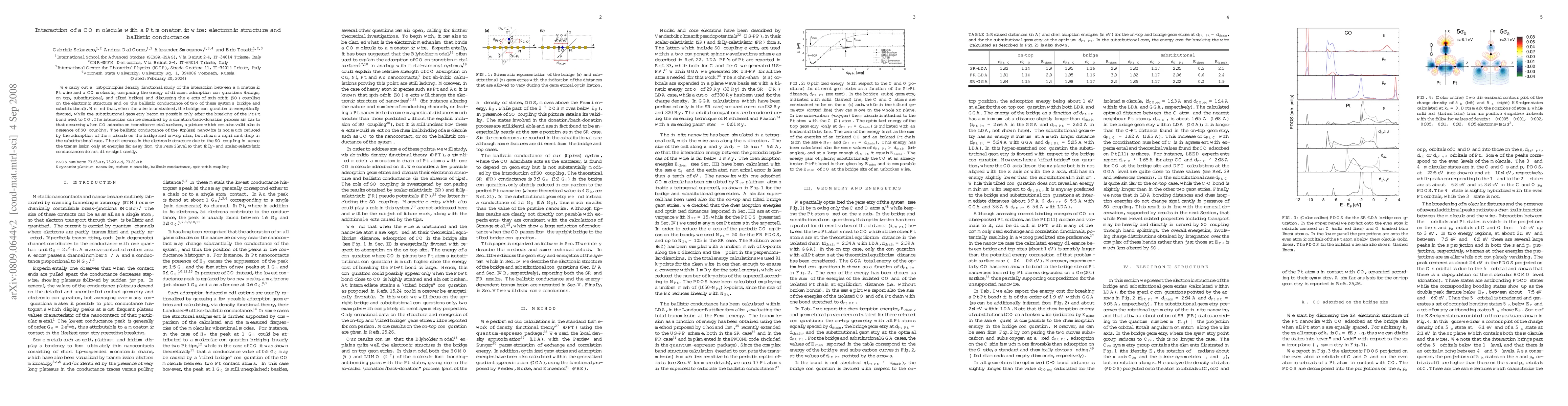 We carry out a first-principles density functional study of the interaction between a monatomic Pt wire and a CO molecule, comparing the energy of different adsorption configurations (bridge, on top, substitutional, and tilted bridge) and discussing the effects of spin-orbit (SO) coupling on the electronic structure and on the ballistic conductance of two of these systems (bridge and substitutional). We find that, when the wire is unstrained, the bridge configuration is energetically favored, while the substitutional geometry becomes possible only after the breaking of the Pt-Pt bond next to CO. The interaction can be described by a donation/back-donation process similar to that occurring when CO adsorbs on transition-metal surfaces, a picture which remains valid also in presence of SO coupling. The ballistic conductance of the (tipless) nanowire is not much reduced by the adsorption of the molecule on the bridge and on-top sites, but shows a significant drop in the substitutional case. The differences in the electronic structure due to the SO coupling influence the transmission only at energies far away from the Fermi level so that fully- and scalar-relativistic conductances do not differ significantly.