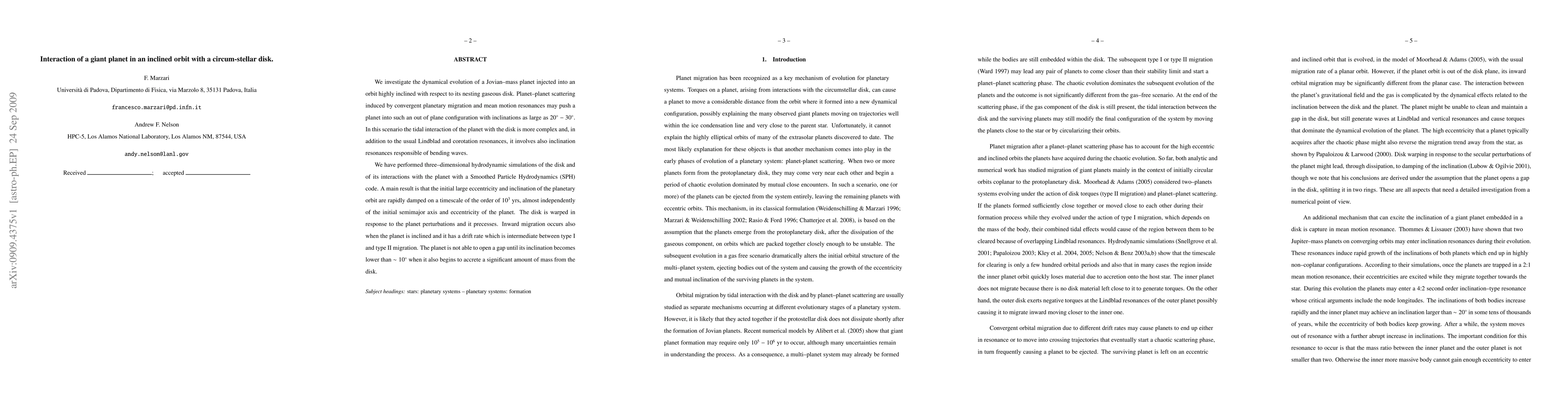 We investigate the dynamical evolution of a Jovian--mass planet injected into an orbit highly inclined with respect to its nesting gaseous disk. Planet--planet scattering induced by convergent planetary migration and mean motion resonances may push a planet into such an out of plane configuration with inclinations as large as $20^\circ-30^\circ$. In this scenario the tidal interaction of the planet with the disk is more complex and, in addition to the usual Lindblad and corotation resonances, it involves also inclination resonances responsible of bending waves. We have performed three--dimensional hydrodynamic simulations of the disk and of its interactions with the planet with a Smoothed Particle Hydrodynamics (SPH) code. A main result is that the initial large eccentricity and inclination of the planetary orbit are rapidly damped on a timescale of the order of $10^3$ yrs, almost independently of the initial semimajor axis and eccentricity of the planet. The disk is warped in response to the planet perturbations and it precesses. Inward migration occurs also when the planet is inclined and it has a drift rate which is intermediate between type I and type II migration. The planet is not able to open a gap until its inclination becomes lower than $\sim 10^\circ$ when it also begins to accrete a significant amount of mass from the disk.